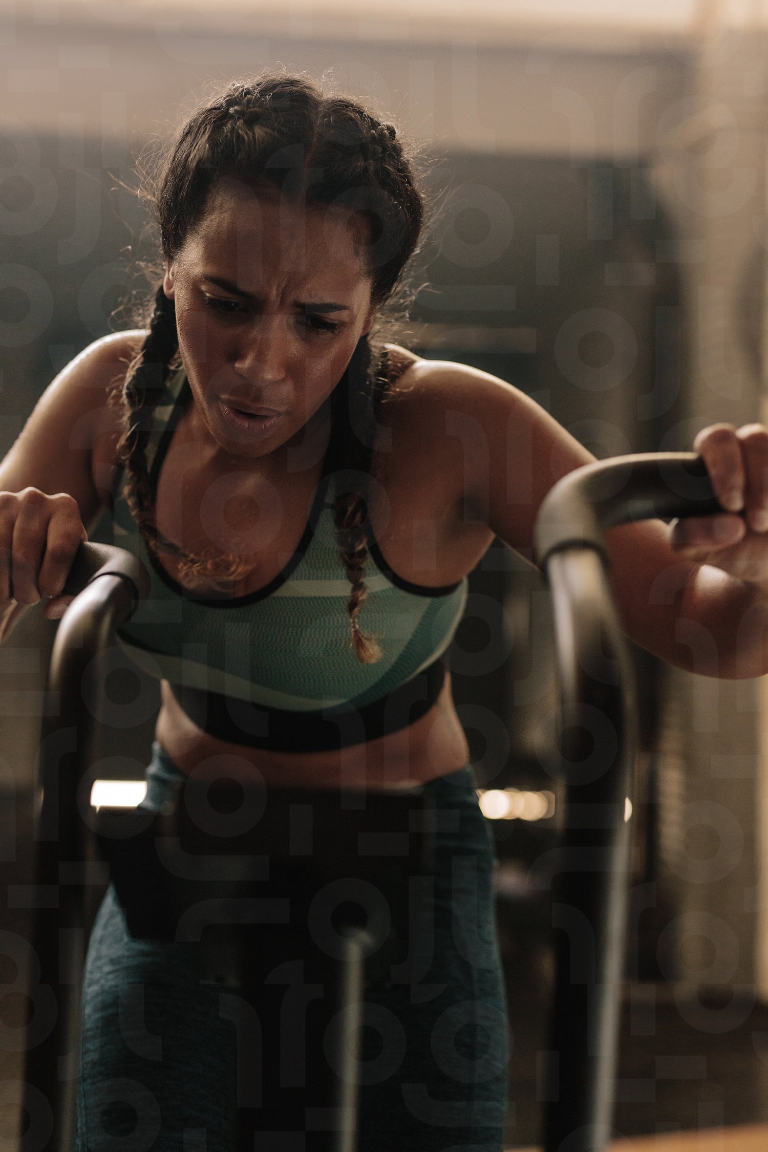 Female doing intense workout on exercise bike