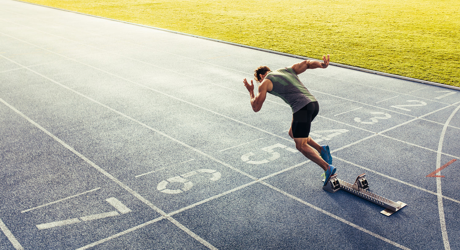 Rear view of an athlete starting his sprint on an all-weather running track. Runner using starting block to start his run on race track.