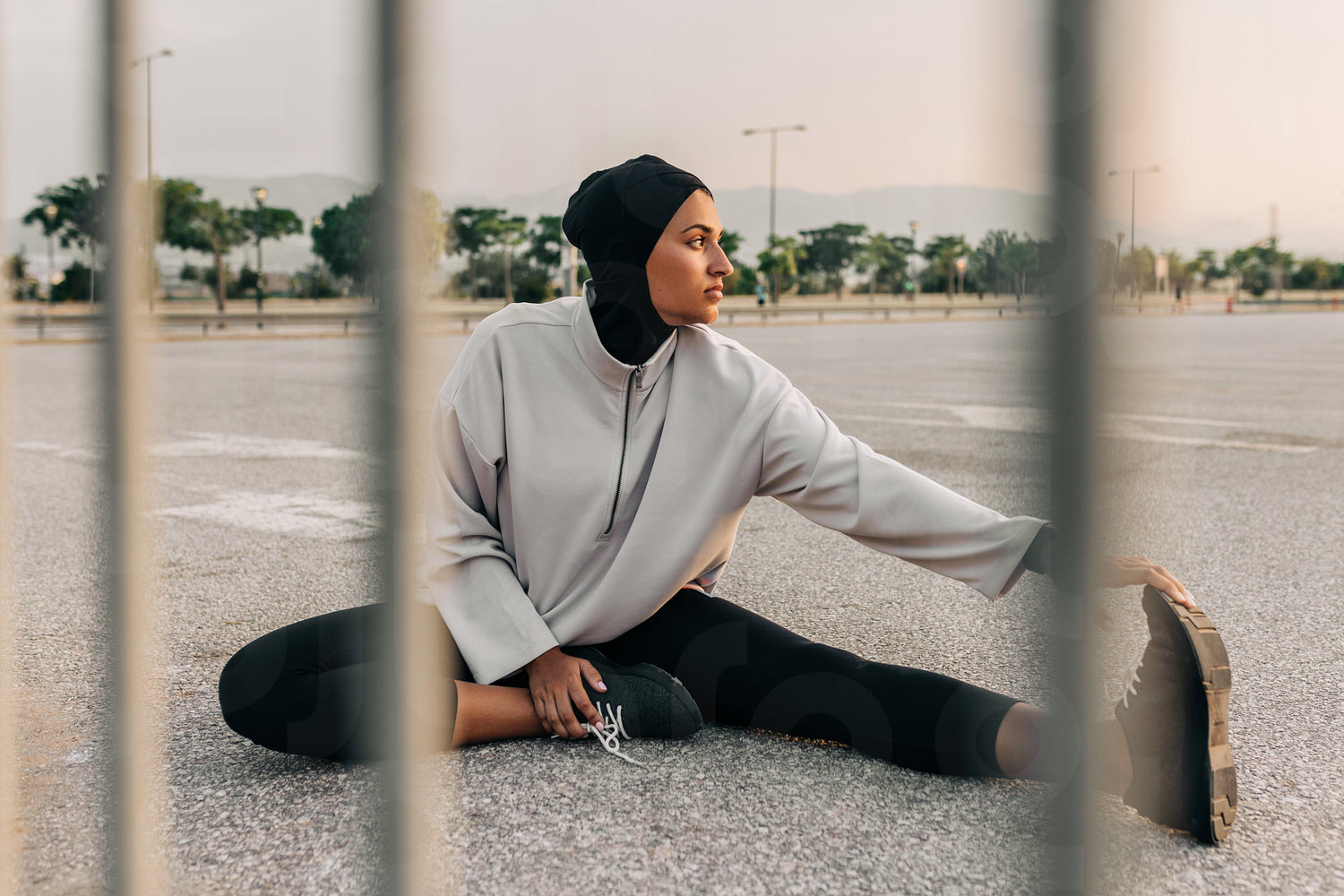 Young Muslim woman warming up by doing stretch exercises outdoors in the morning. Sporty woman with a hijab having a workout session in the city.