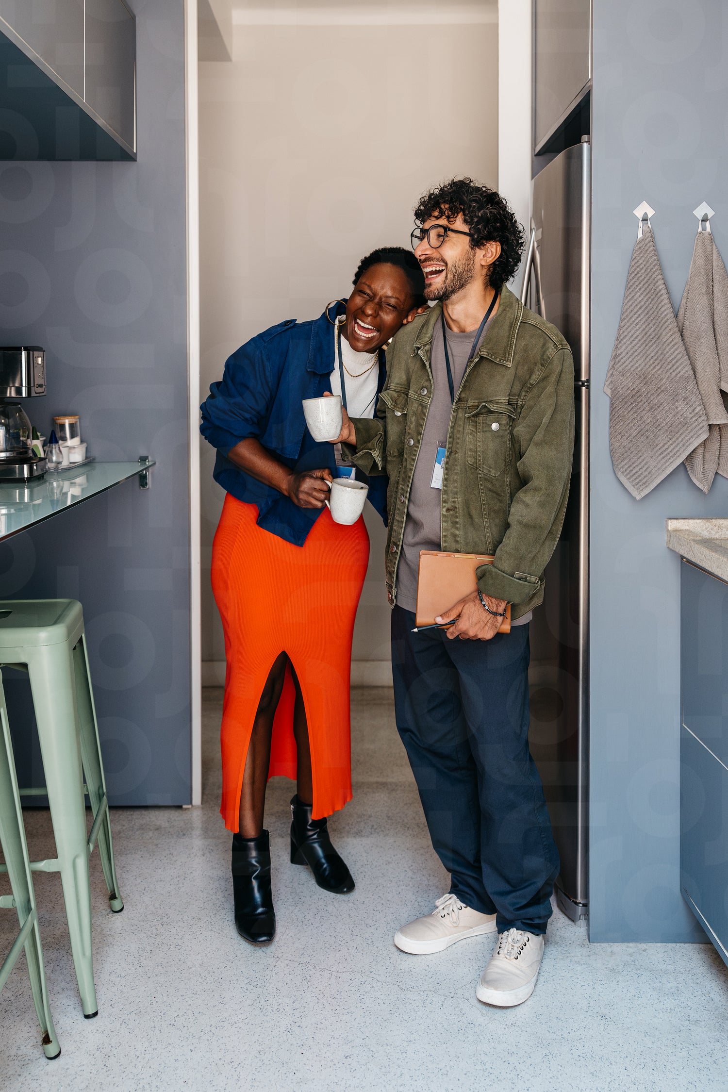 Two co-workers enjoying a light-hearted moment during a coffee break in the office, laughing and bonding together.