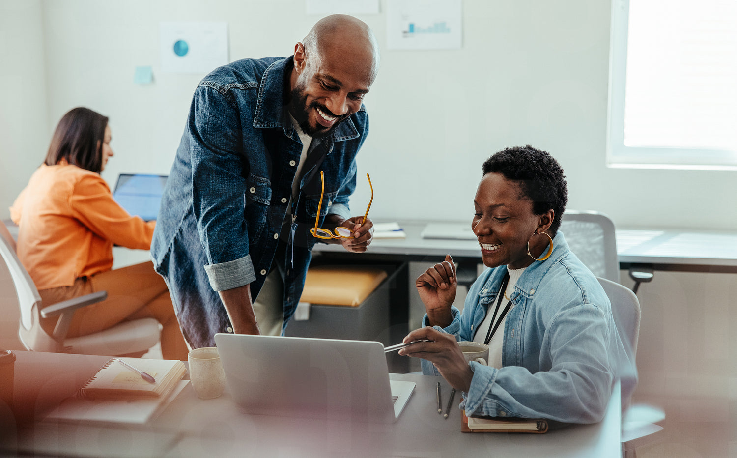 Manager providing feedback to an employee during a collaborative review discussion. Both are smiling, promoting a positive work environment in a modern office setting.