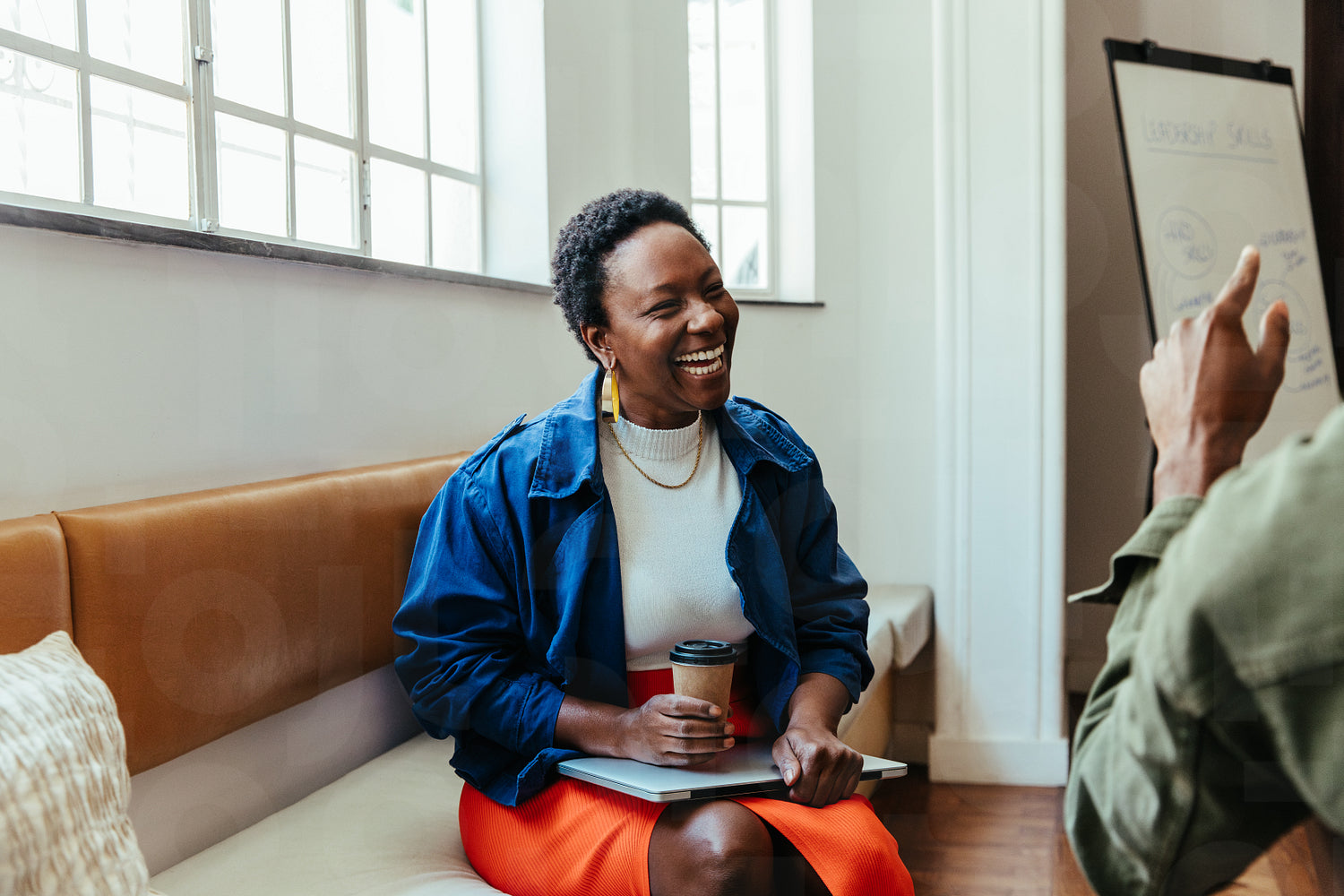 Stylish professional woman enjoying a casual discussion with a colleague during a business meeting. Team collaborating with positive energy and engagement.