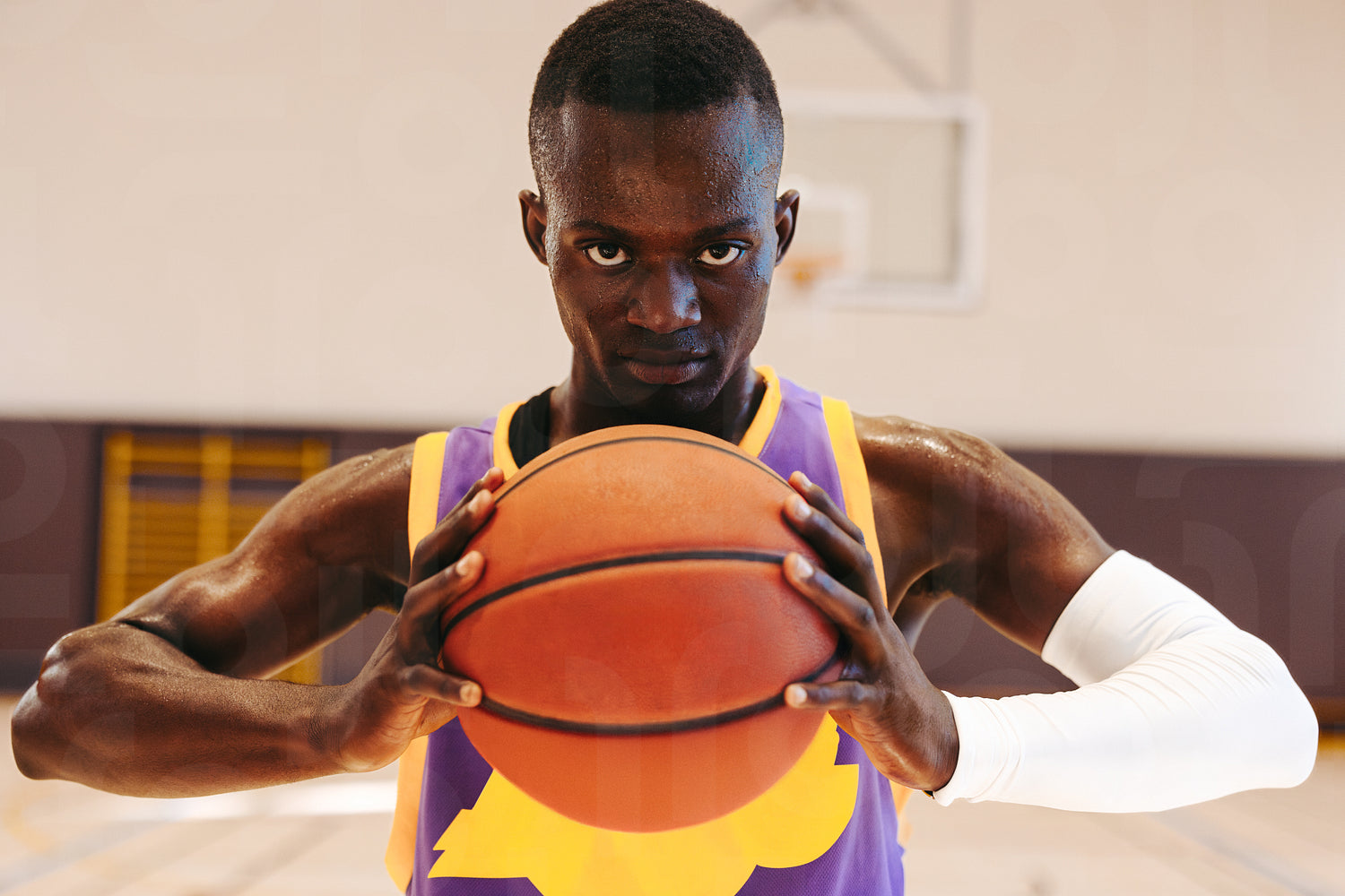 With a calm but serious look, a basketball player holds the ball in front of him and looks straight down the lens, full of purpose and radiating focus and readiness for action.