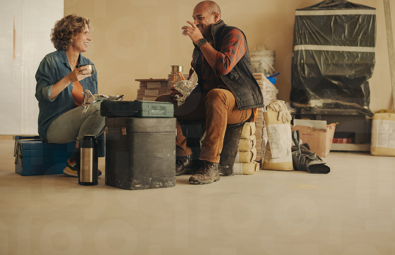 Married couple collaborating on a home renovation project. They pause to chat, savoring coffee. Engaged in teamwork, the mature husband and wife discuss and upgrade the interior of their house.