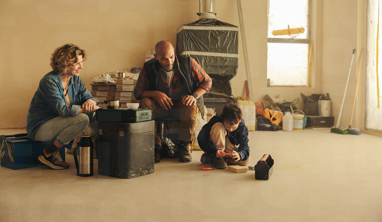 Parents on a home renovation project take a coffee break while their son plays with the tools. They work together as a team, embracing the challenges of DIY home improvement with smiles.