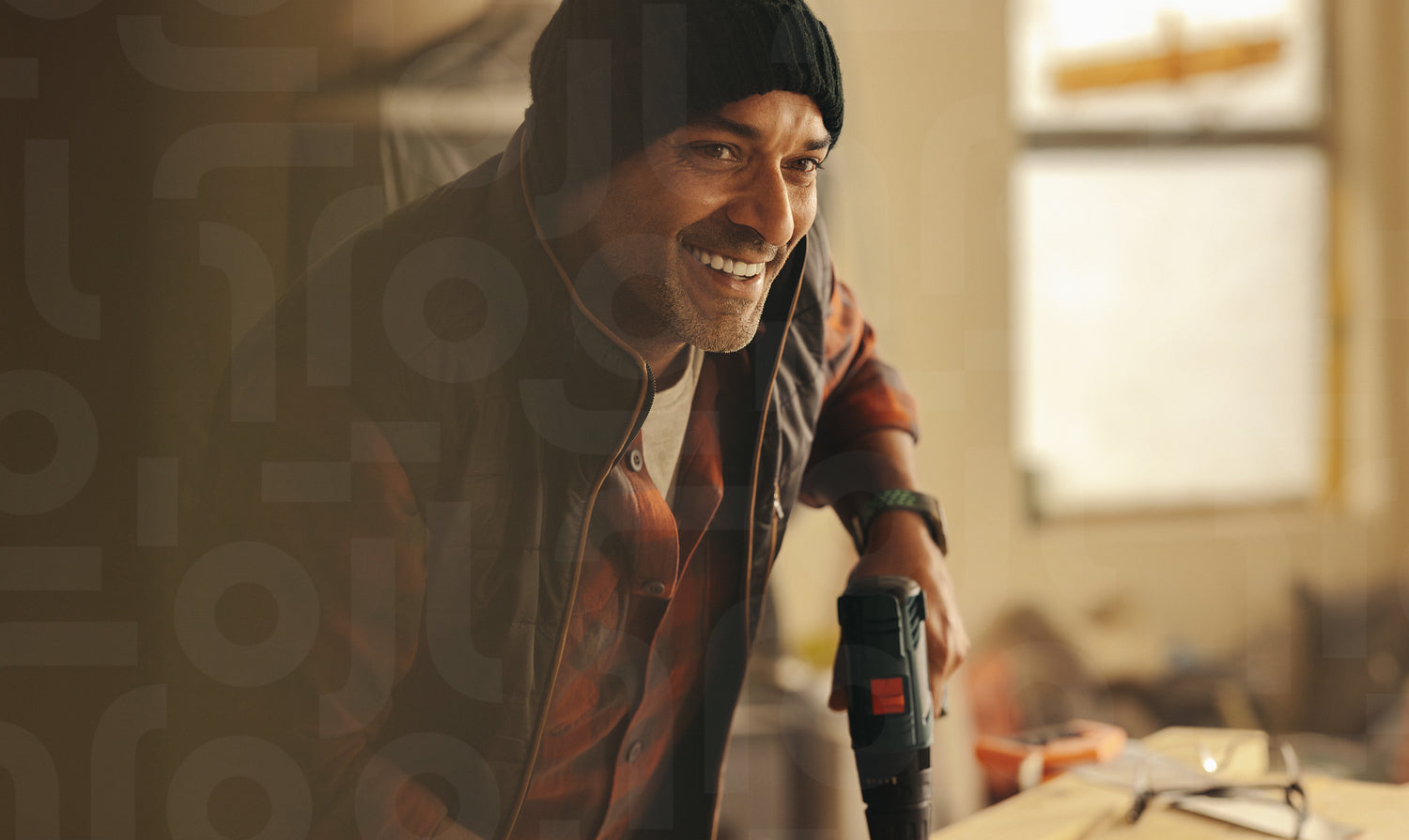 Happy DIY carpenter remodeling his kitchen for a home renovation project. He is using a drill gun and working to upgrade the interior. Skilled man smiling while doing woodwork for a refurbished space.