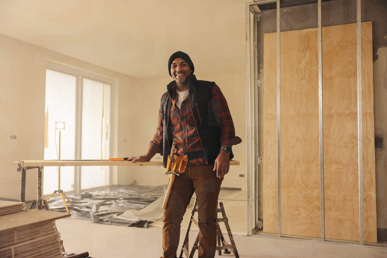Happy contractor in a tool belt stands in a kitchen of a house under renovation. He looks at the camera, smiling. The builder is working on the interior remodel, equipped with construction tools to upgrade the home.