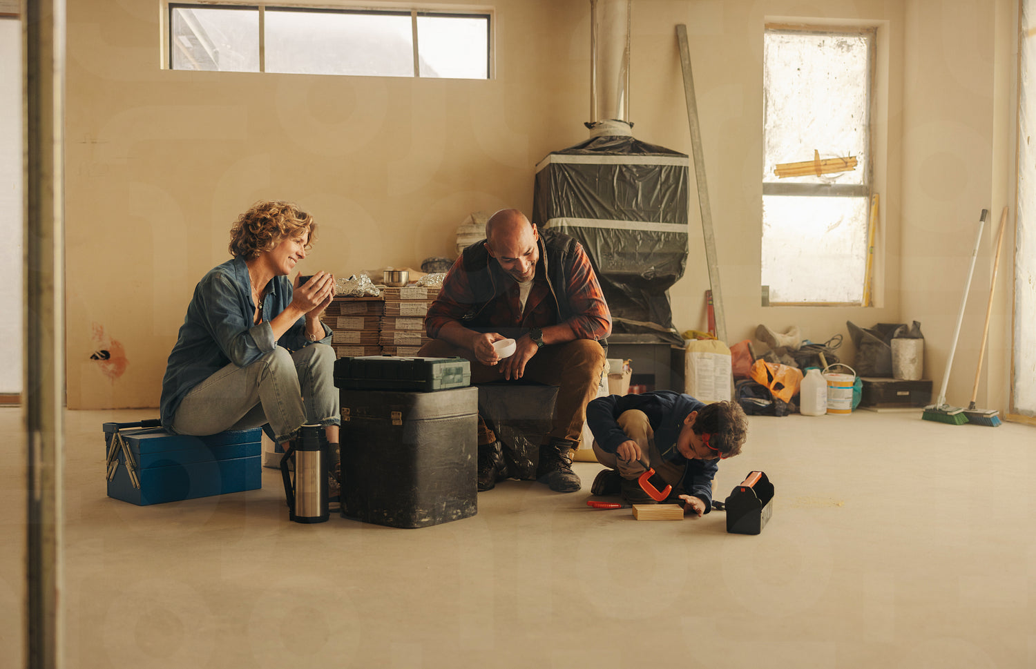 Parents resting during their home renovation project, enjoying coffee together while their child plays with the tools nearby. Their teamwork shines as they work on remodeling and upgrading their house together.