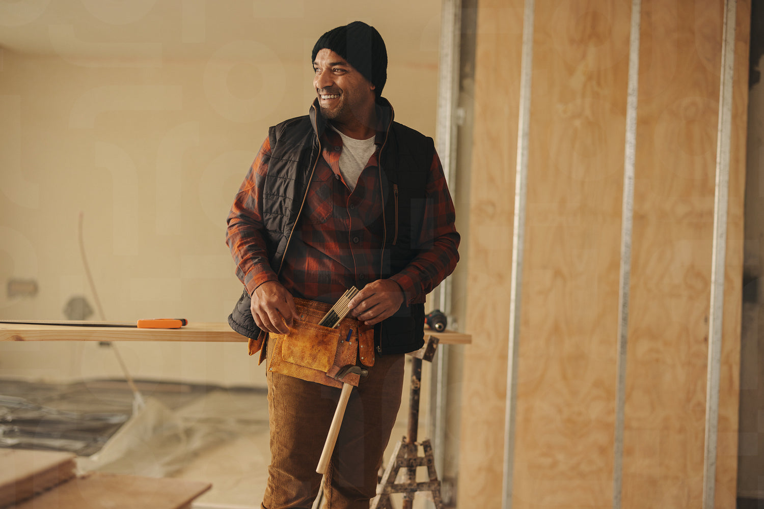 Happy male builder, wearing a tool belt, stands indoors. He is working on a home renovation, remodeling, and refurbishment project. The experienced worker's smile showcases his expertise in construction.