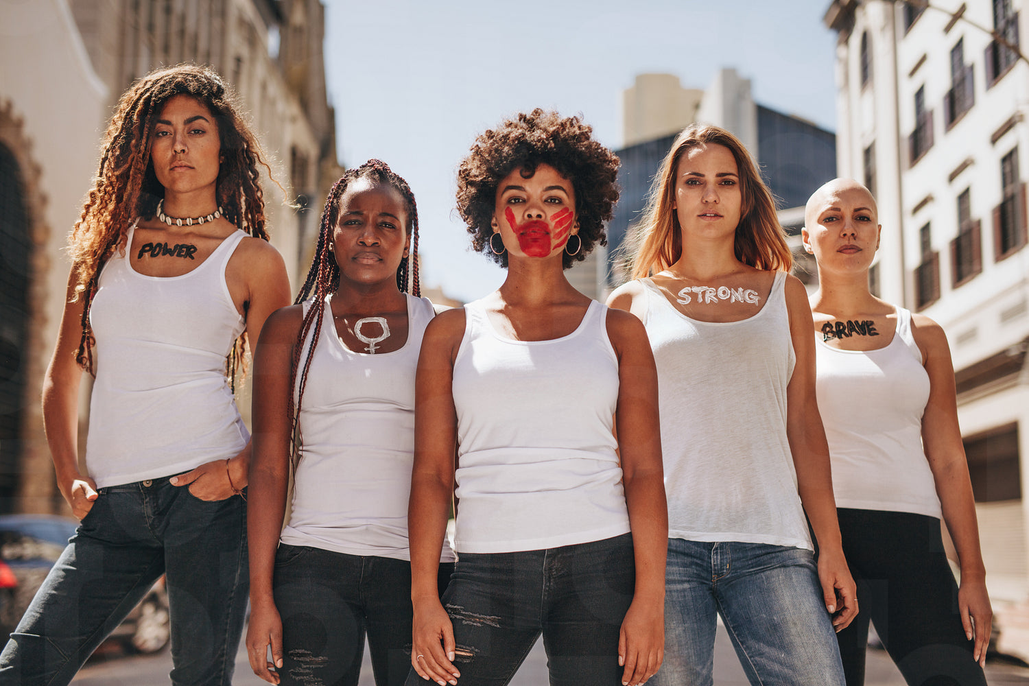 Group of female activists in dress code demonstrating outdoors. Protesting for women rights and equality.