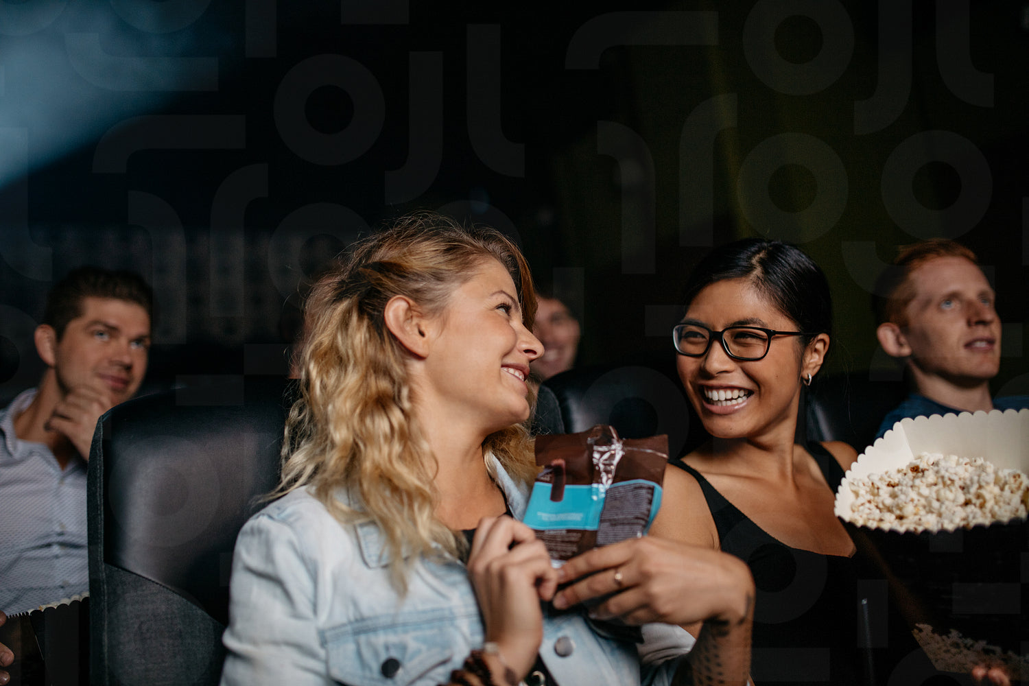 Two young woman chatting and smiling while sitting in movie theater. Group of people watching movie together.