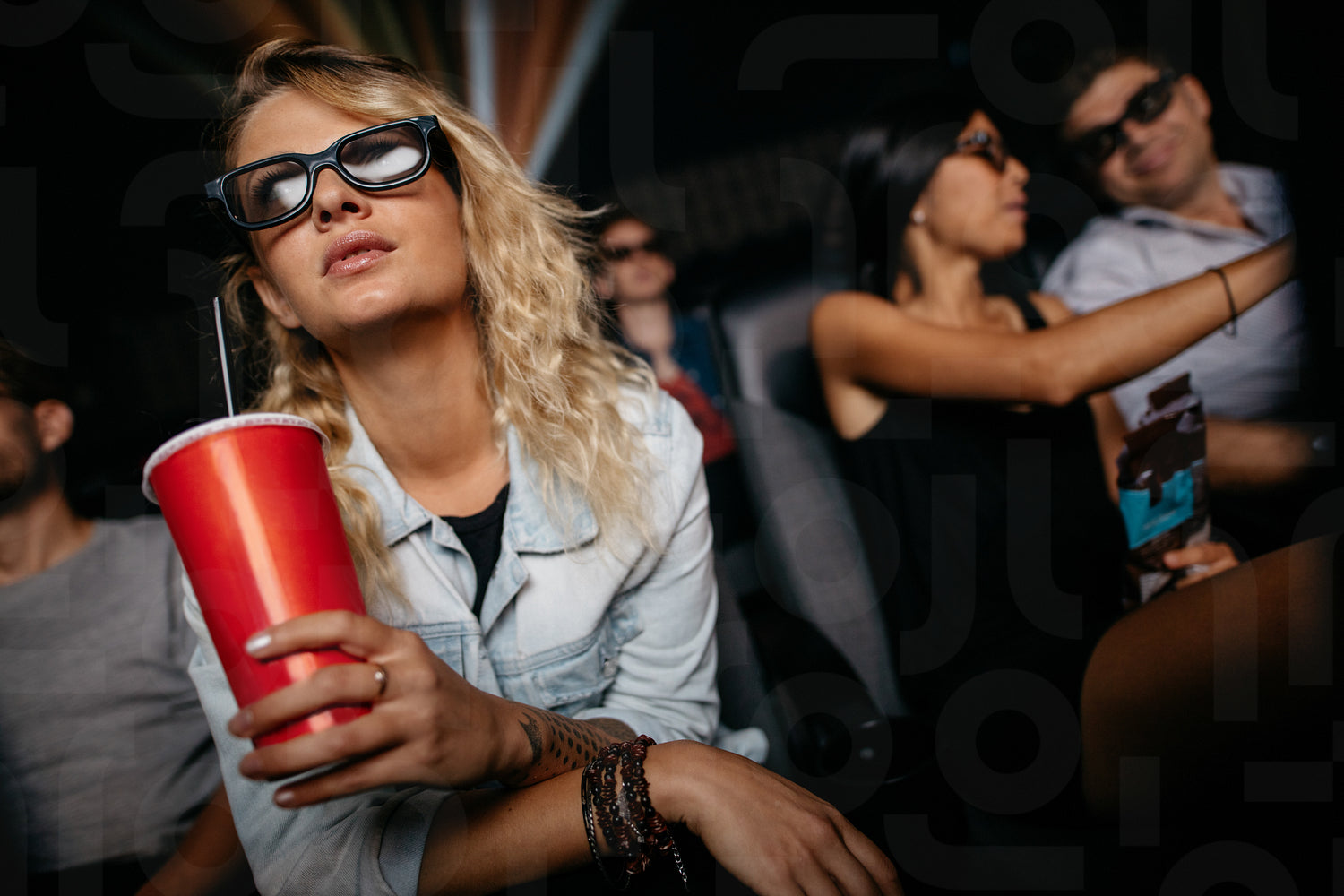 Young woman with cold drink and 3d glasses watching movie in theater. People in cinema watching 3d movie.