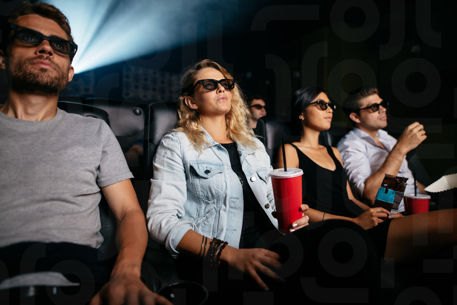 Group of people in 3D glasses watching movie in cinema. Men and women with drinks watching 3d film.