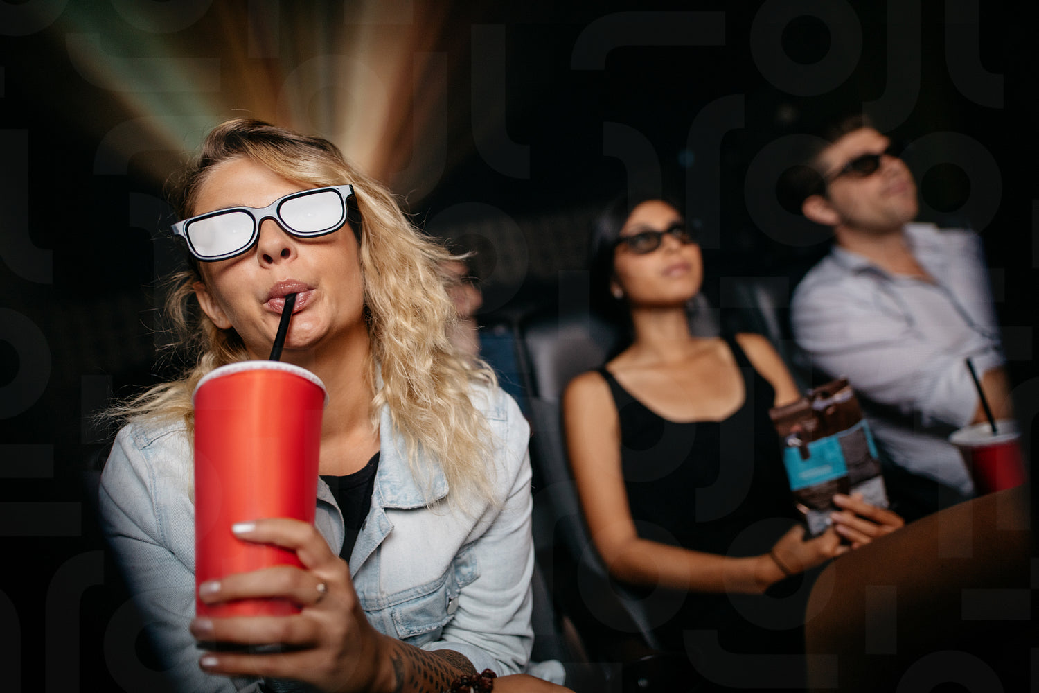 Young woman having cold drink wearing 3d glasses and watching movie in theater. People in cinema watching 3d film.