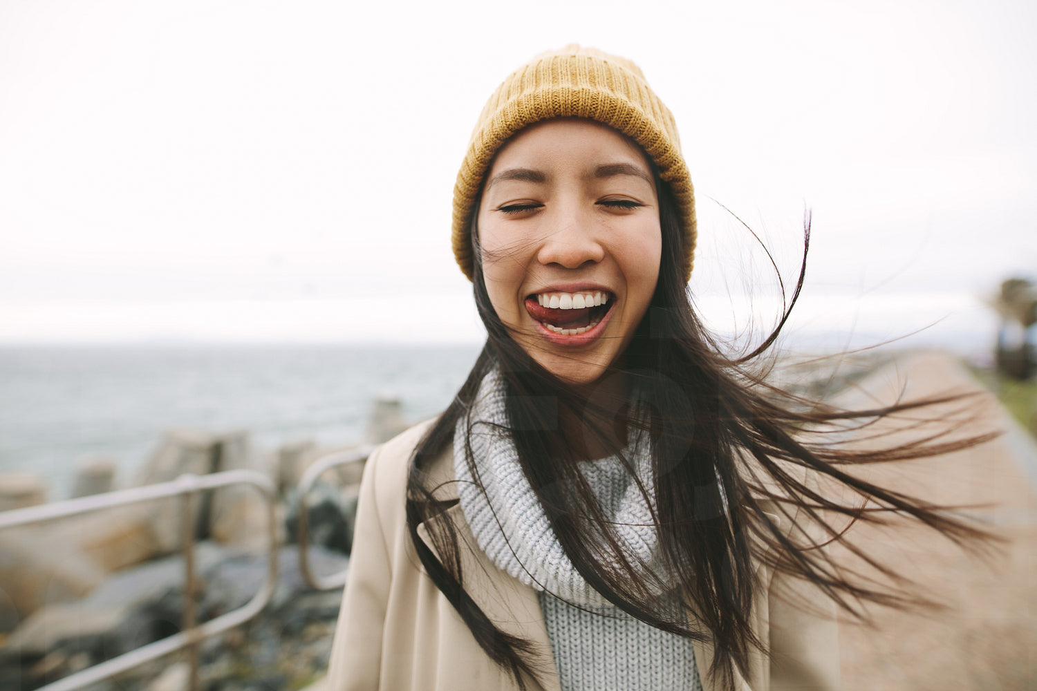 Cheerful asian woman standing beside the sea in warm winter clothes. Happy woman standing outdoors making faces with her hair flying.