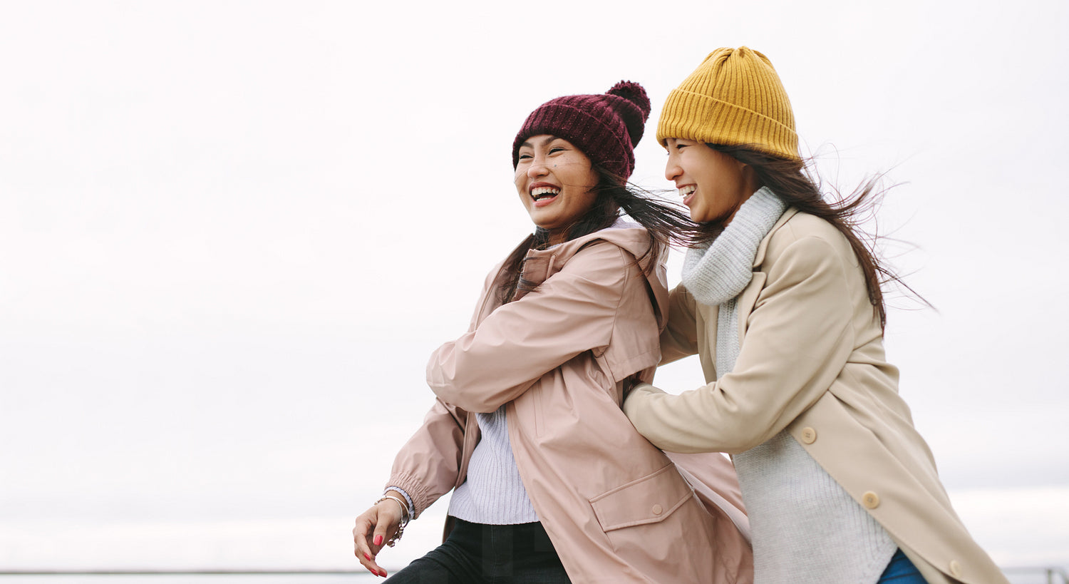 Happy asian woman in winter wear standing outdoors on a cold winter morning. Cheerful women standing outdoors holding each other and having fun on a winter morning.