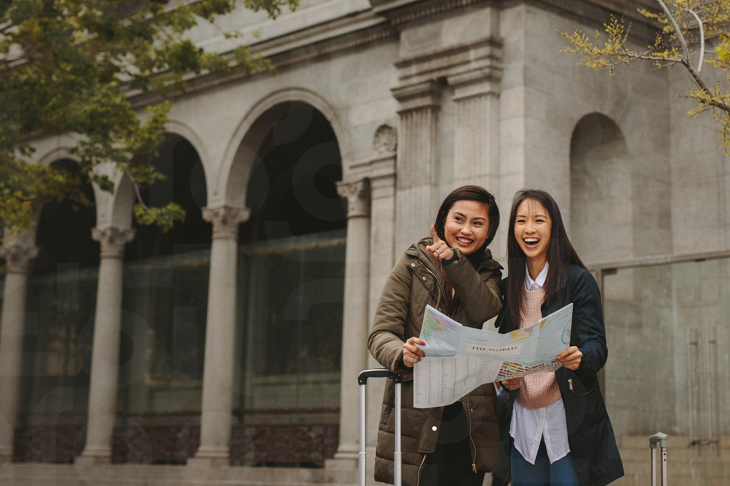 Cheerful female tourists standing on street exploring the city holding a map. Asian tourist women looking at a navigation map to find the route.