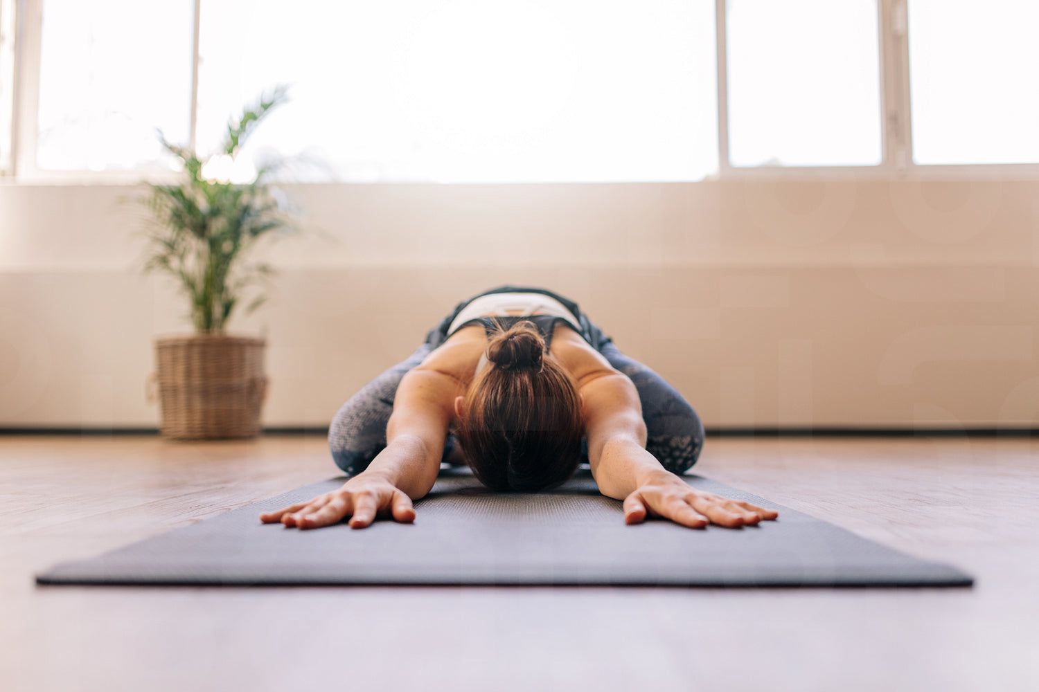 Fit woman performing child yoga pose at gym class. Fitness woman working out on yoga mat indoors.
