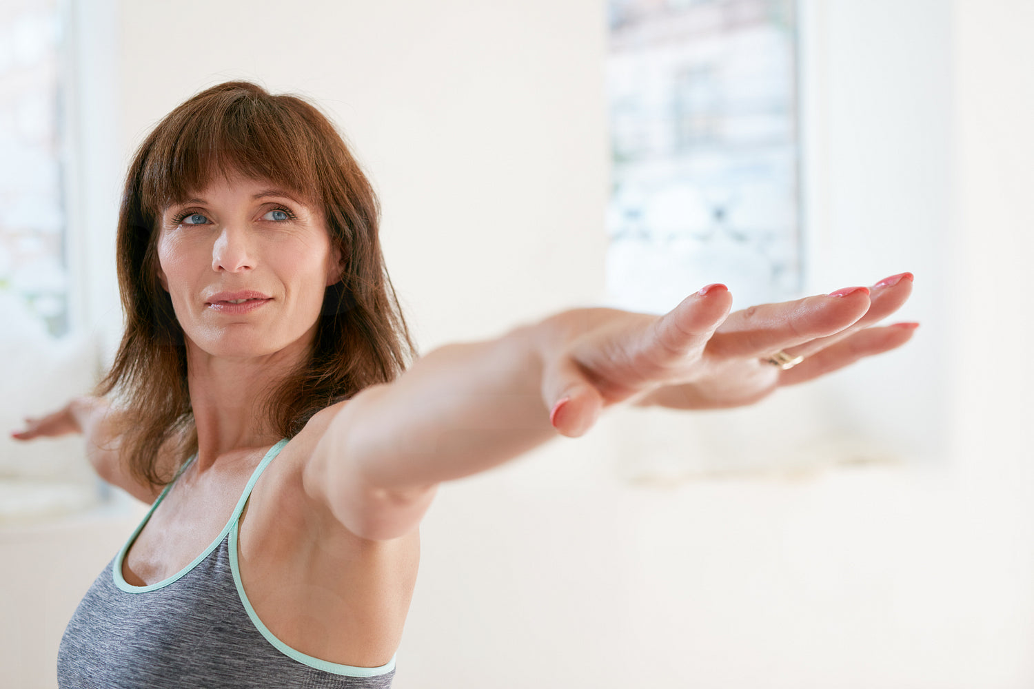 Portrait of fitness woman stretching her hands and looking away. Attractive mature woman exercising yoga in Virabhadrasana pose. Female doing warrior pose in gym.