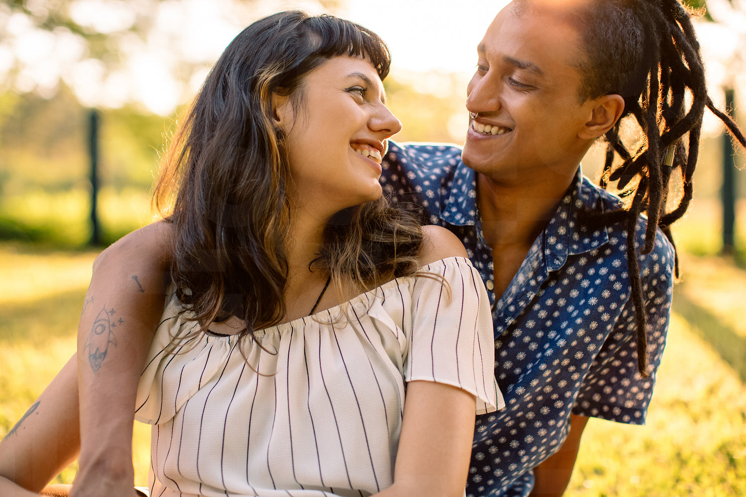 Blissful young couple smiling at each other outdoors. Two affectionate young lovers enjoying a romantic moment together while sitting in a park during the day.