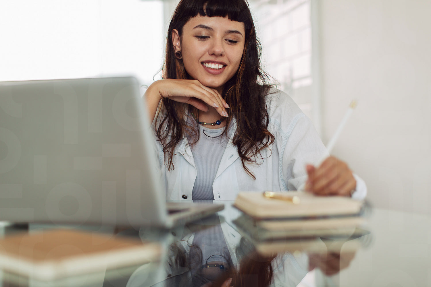 Cheerful young businesswoman making notes while working alone at her home office desk. Young businesswoman smiling cheerfully while working from her laptop. Woman working from home.