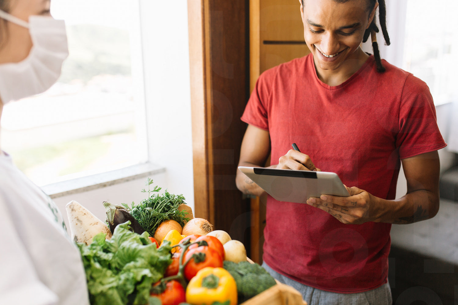 Smiling young man receiving a grocery delivery. Young man signing for his home delivery on a digital tablet while standing in front of the delivery woman. Home delivery during the covid-19 pandemic.