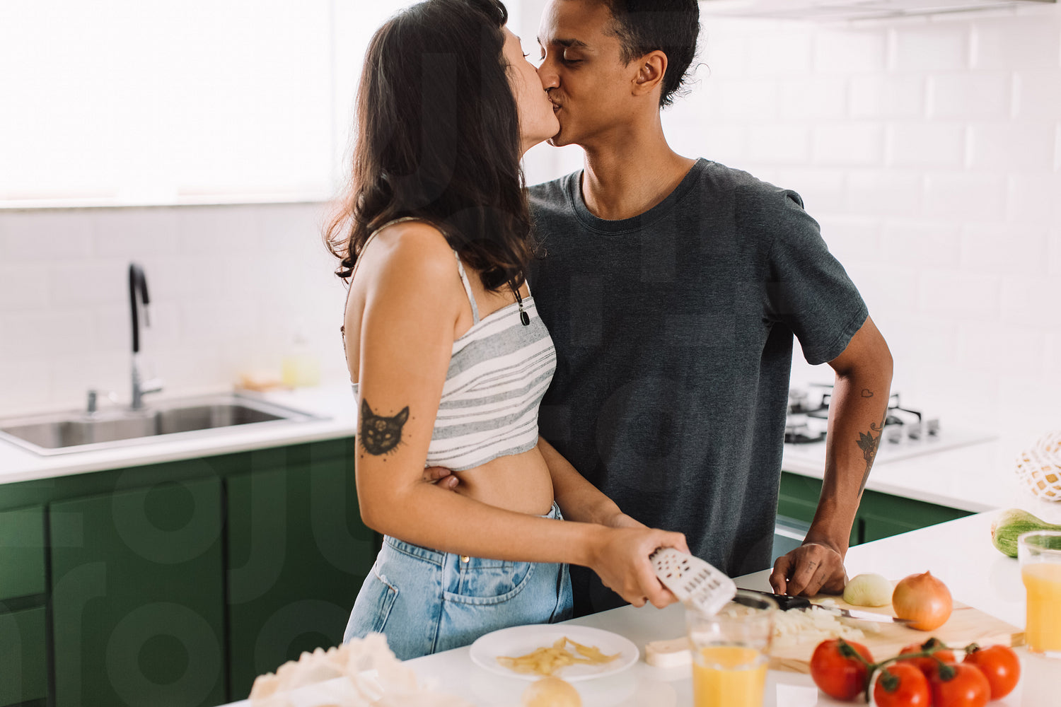 Lovers kissing passionately in the kitchen. Cropped shot of an affectionate young couple stealing a kiss while cooking together. Young couple being romantic at home.