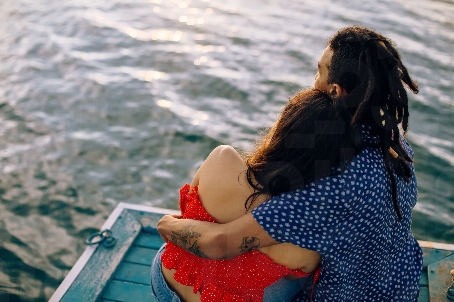 Rearview shot of a young interracial couple bonding affectionately during a vacation. Romantic young man embracing his girlfriend tenderly while sitting on a dock during the day.