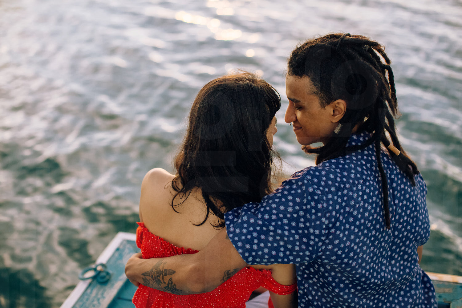 Rearview shot of a passionate young couple bonding affectionately during a vacation. Romantic young man embracing his girlfriend cheerfully while sitting on a dock during the day.