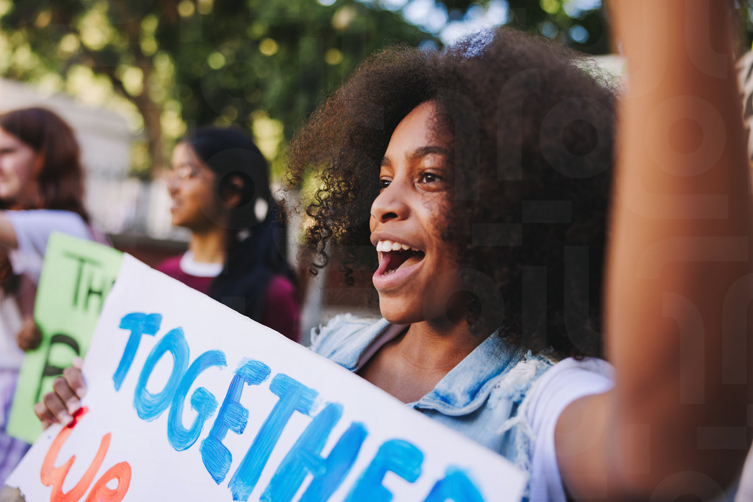 Diverse young people fighting to save the earth. Group of multicultural youth activists carrying posters while marching against climate change. Young people joining the global climate strike.