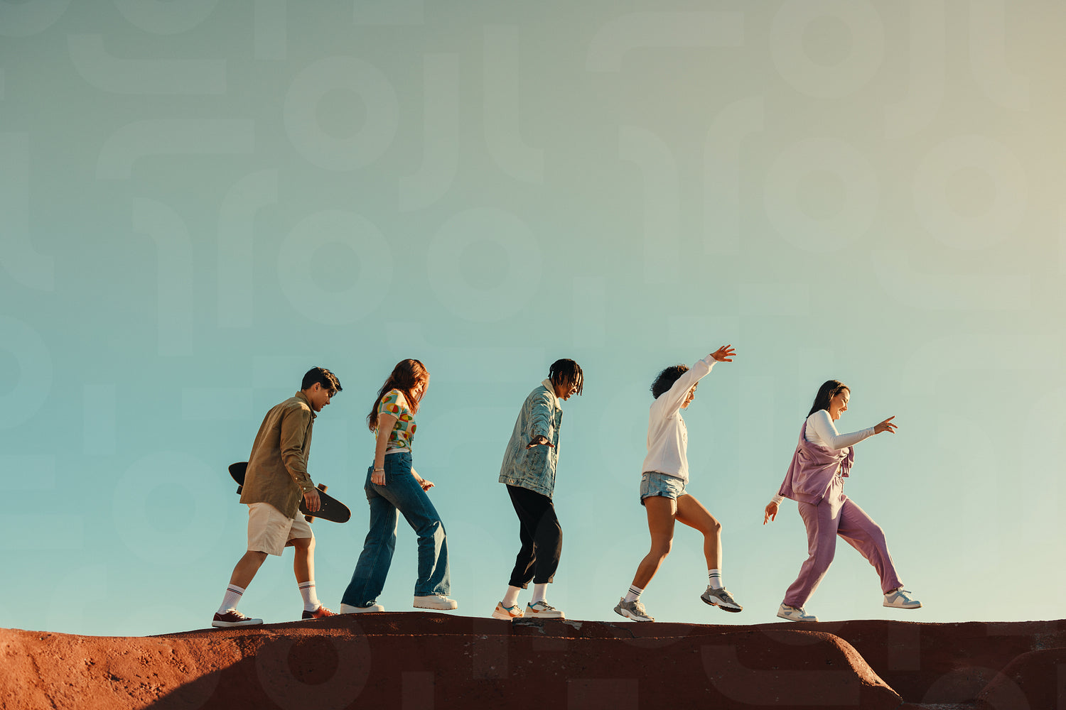 Group of friends traveling together, enjoying youth and adventure with copy space