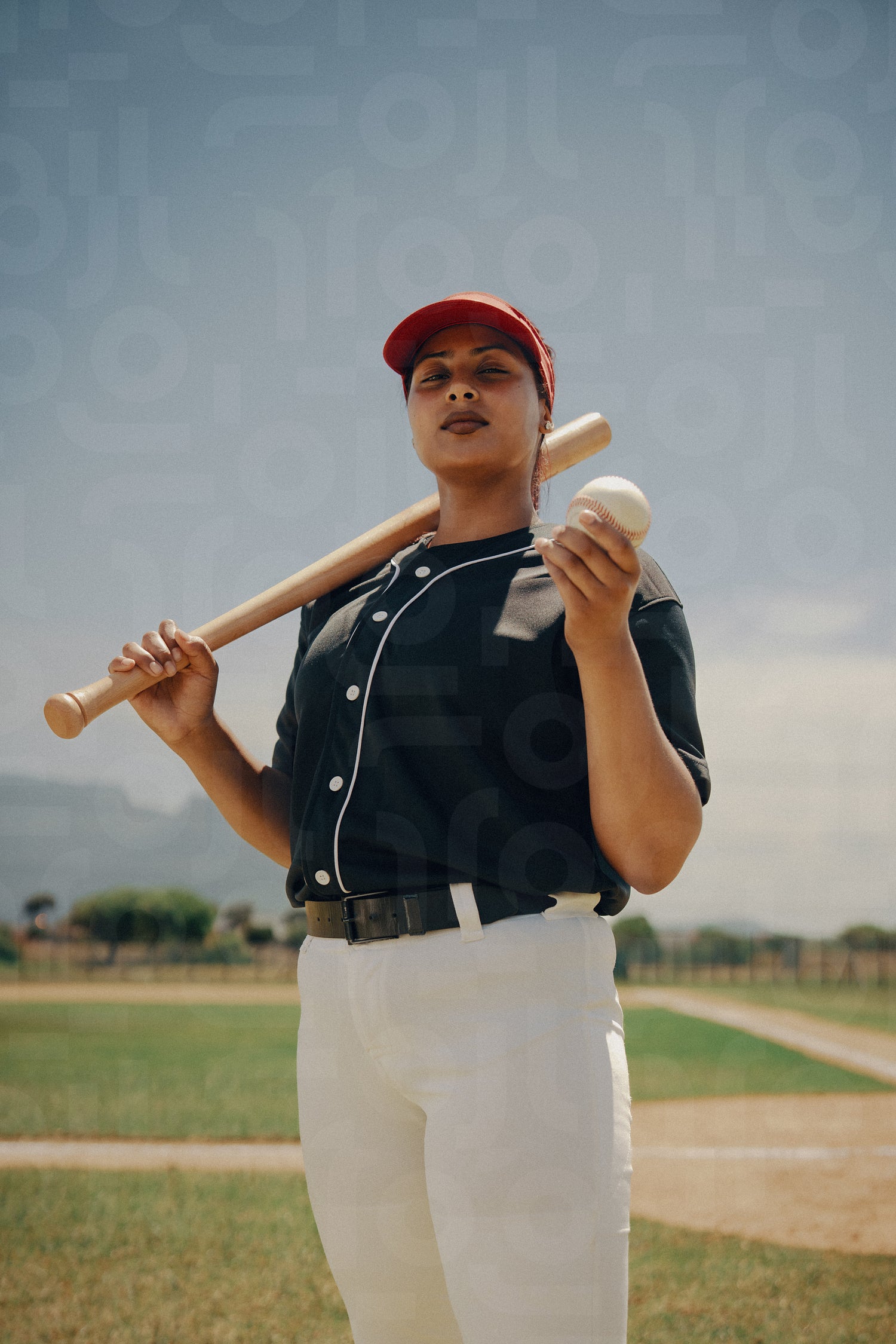 A confident female batter stands poised on a baseball field, holding a bat and ball, ready for action. She exudes determination and strength in this sunny outdoor sports scene. This photo has intentional use of 35mm film grain.