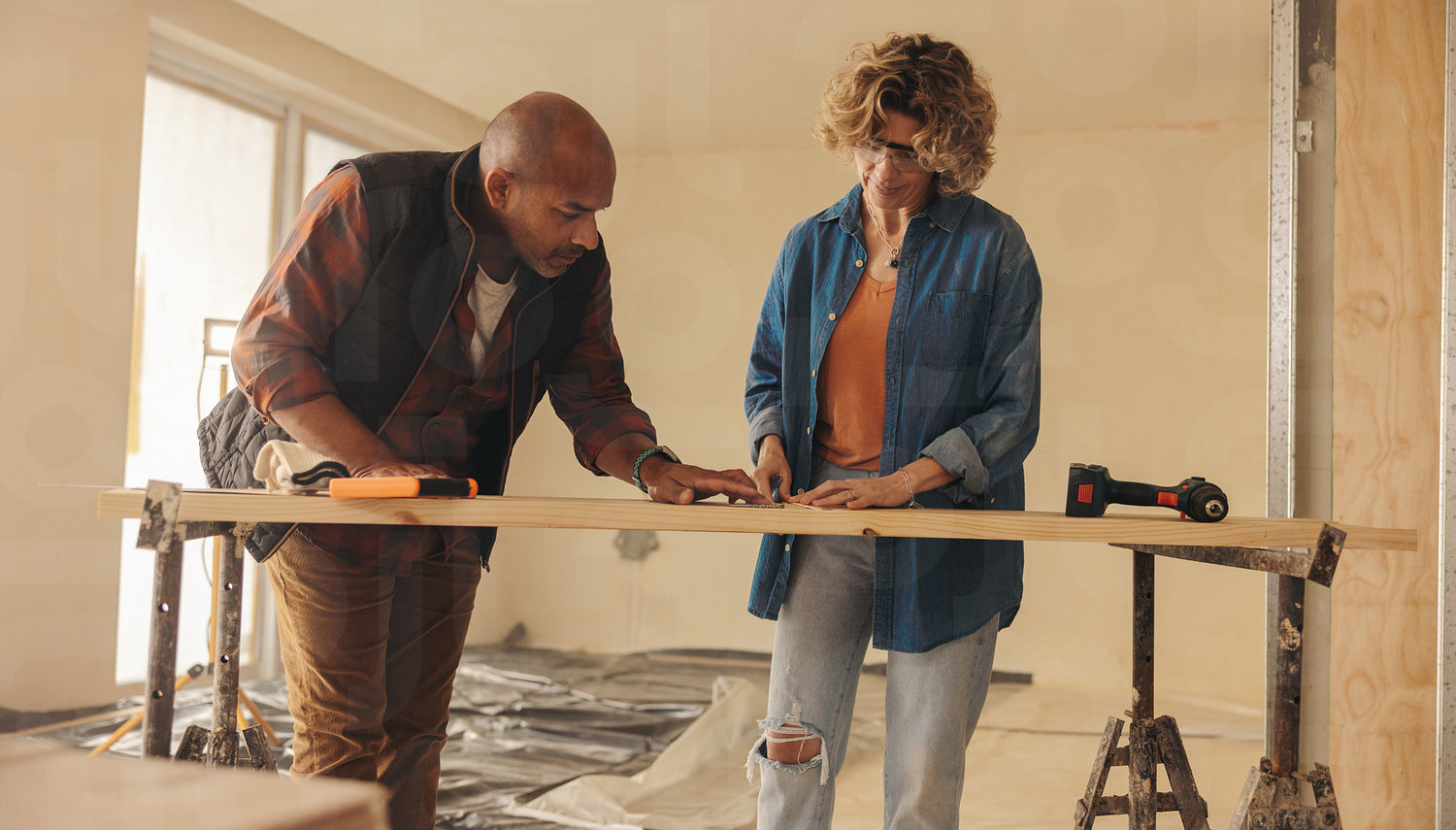 Home renovation: Couple planning upgrades with tape measure and woodwork