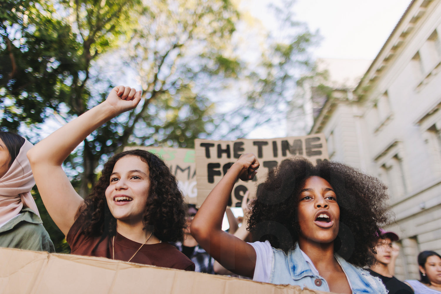 Generation Z taking action against climate change. Group of youth activists protesting against global warming and pollution. Multicultural young people joining the global climate strike.