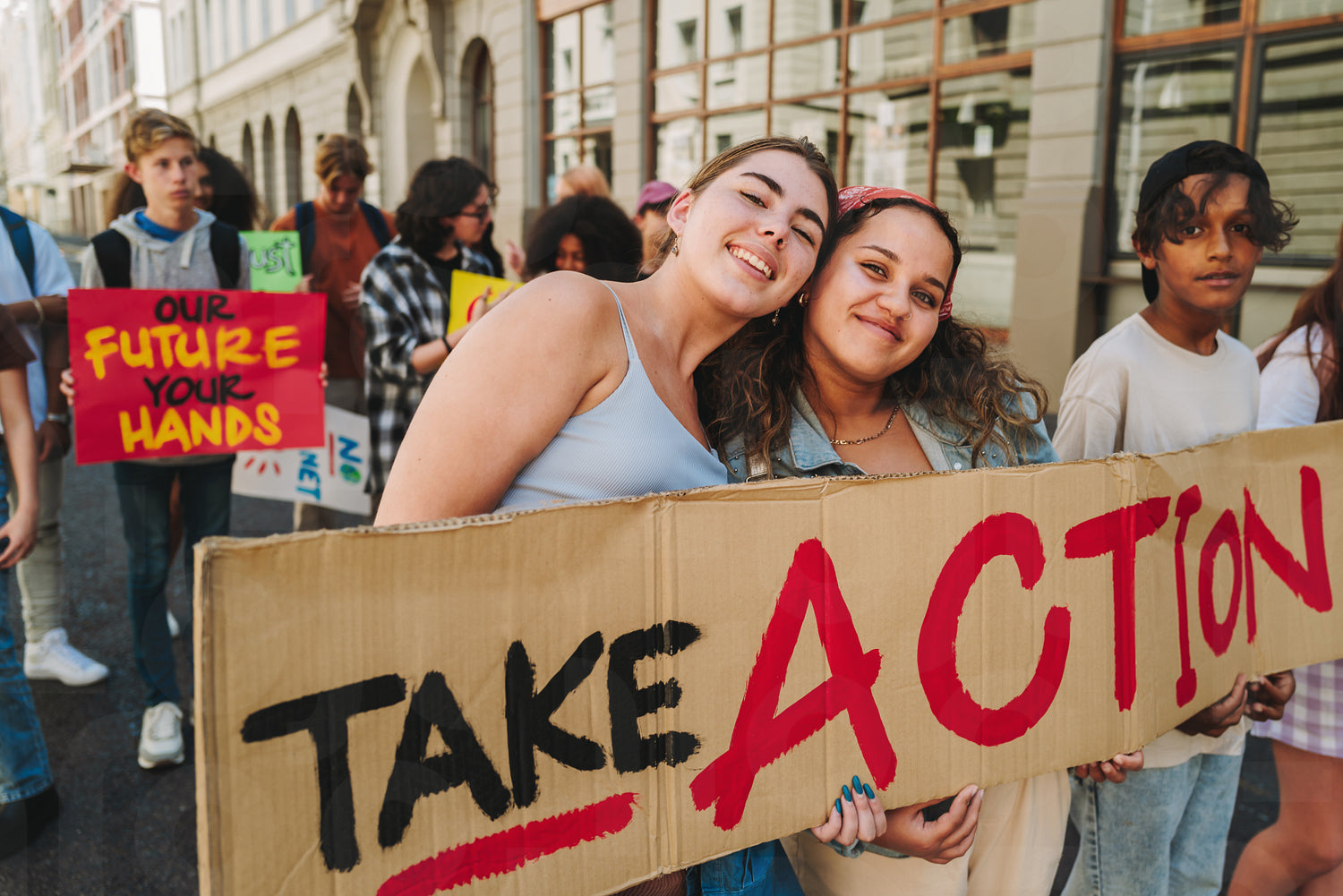 Happy teenage girls holding a banner at a climate change march. Group of multicultural youth activists protesting against global warming. Diverse young people joining the global climate strike.