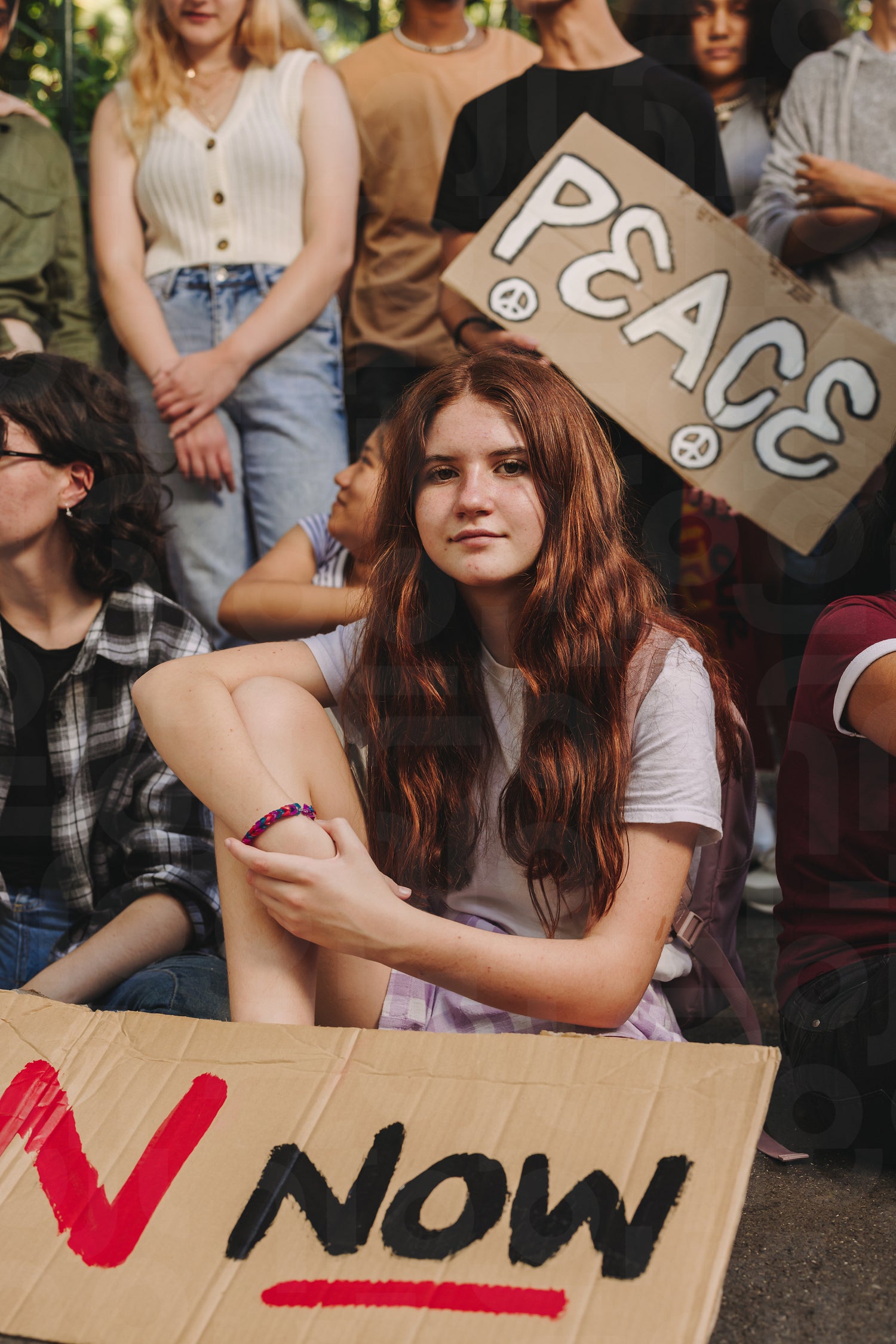 Young girl looking at the camera while sitting with a group of youth peace activists. Multiethnic young people displaying posters and banners while protesting against war.