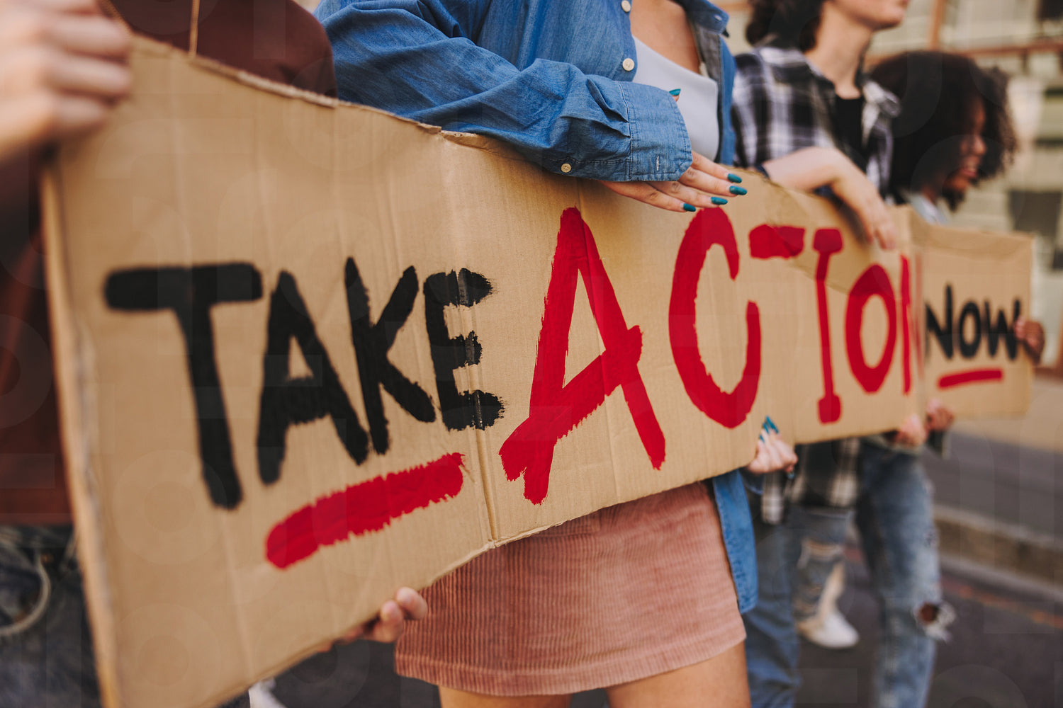 Unrecognizable young people holding a banner while marching against climate change in the city. Multicultural youth activists campaigning for climate justice and environmental sustainability.