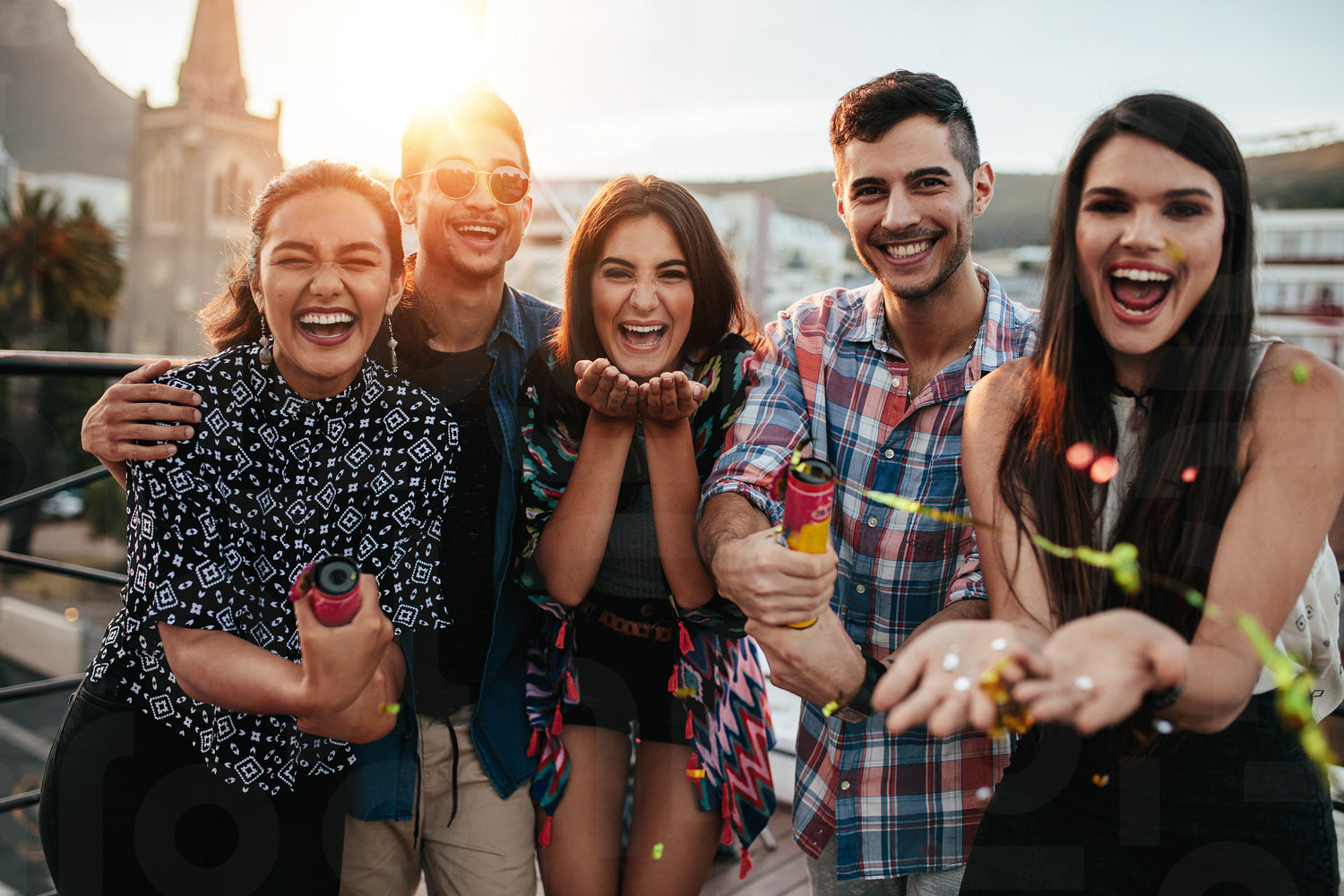 Smiling young people throwing confetti on a rooftop party. Best friends enjoying the party together with confetti.