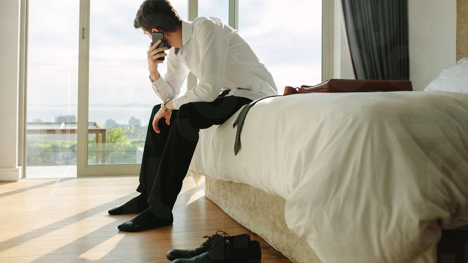 Businessman sitting on his bed and talking on mobile phone. Man making phone call while getting ready for the work.