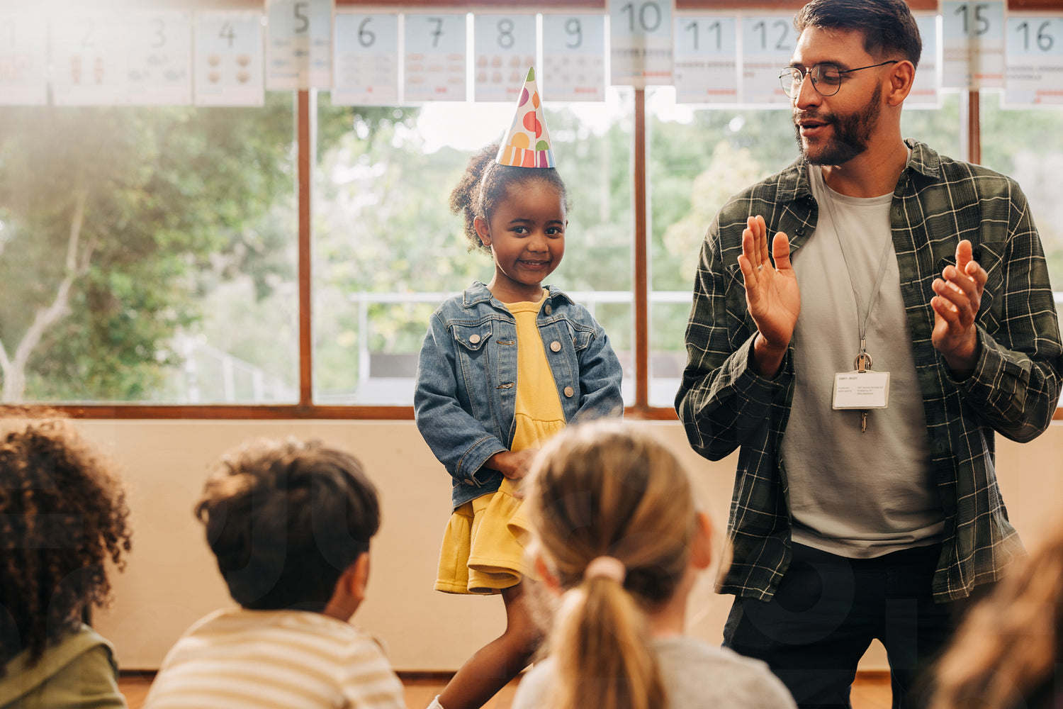 Birthday celebration at primary school class. Little black girl is celebrating her birthday with her classmates and teacher. Fun and child growth in elementary school.