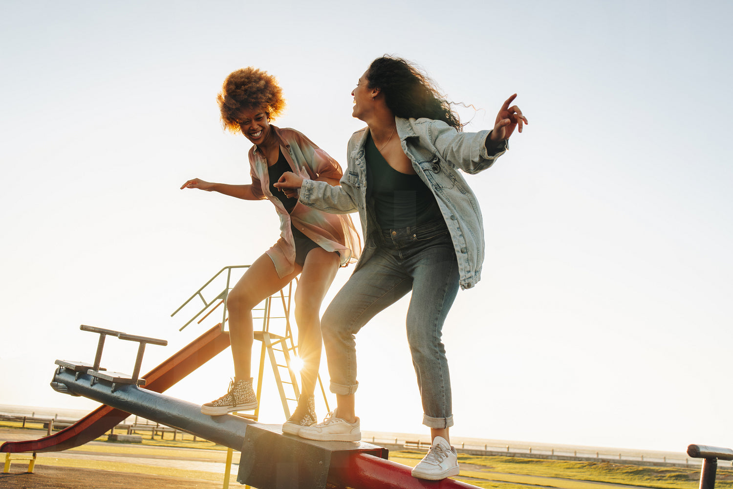 Joyful friends being playful together and having fun on a seesaw in a city park during sunset. Celebrating friendship and enjoying the outdoors in an urban setting.