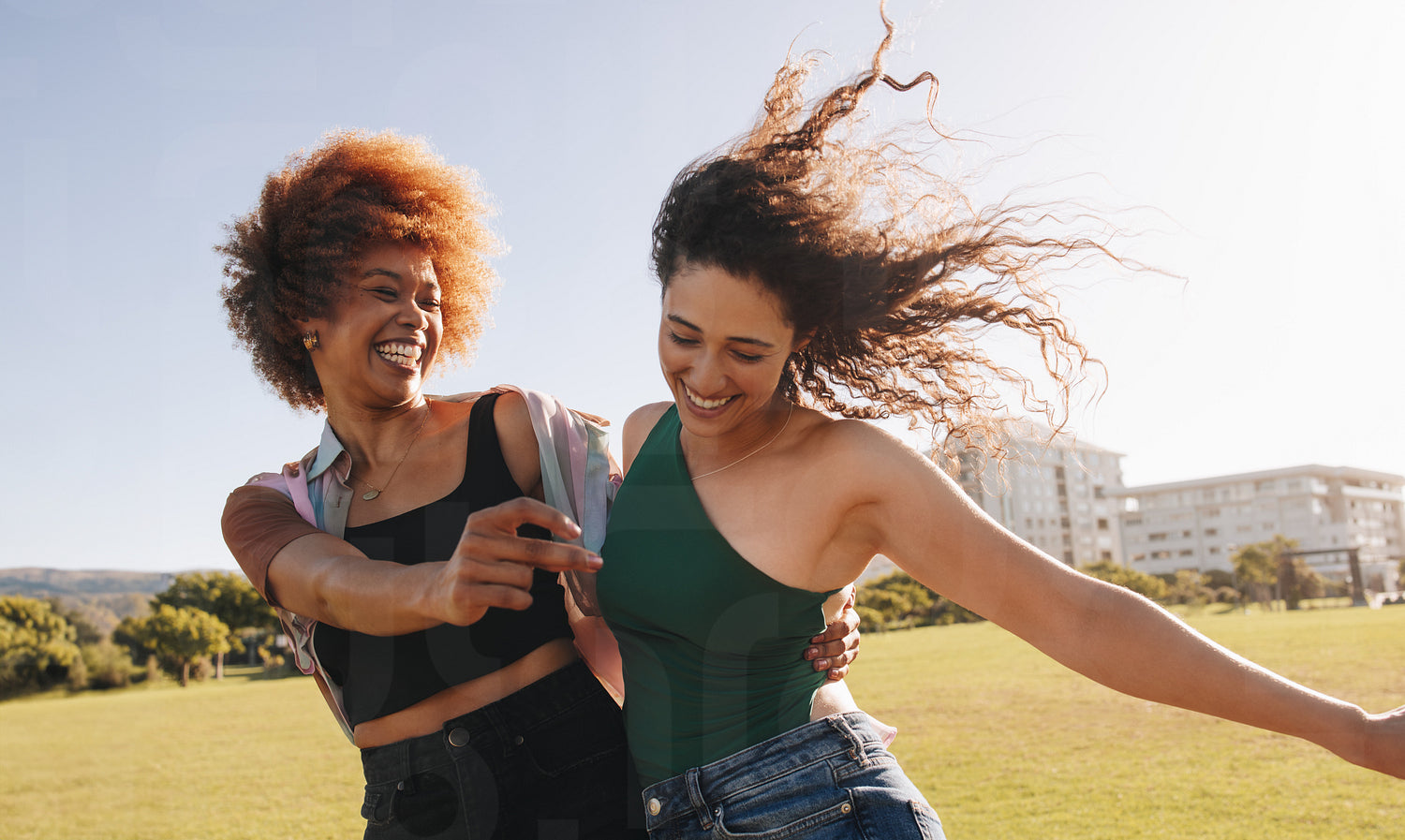 Joyful girlfriends having fun in the sun, smiling and enjoying each other's company while wearing stylish summer fashion.