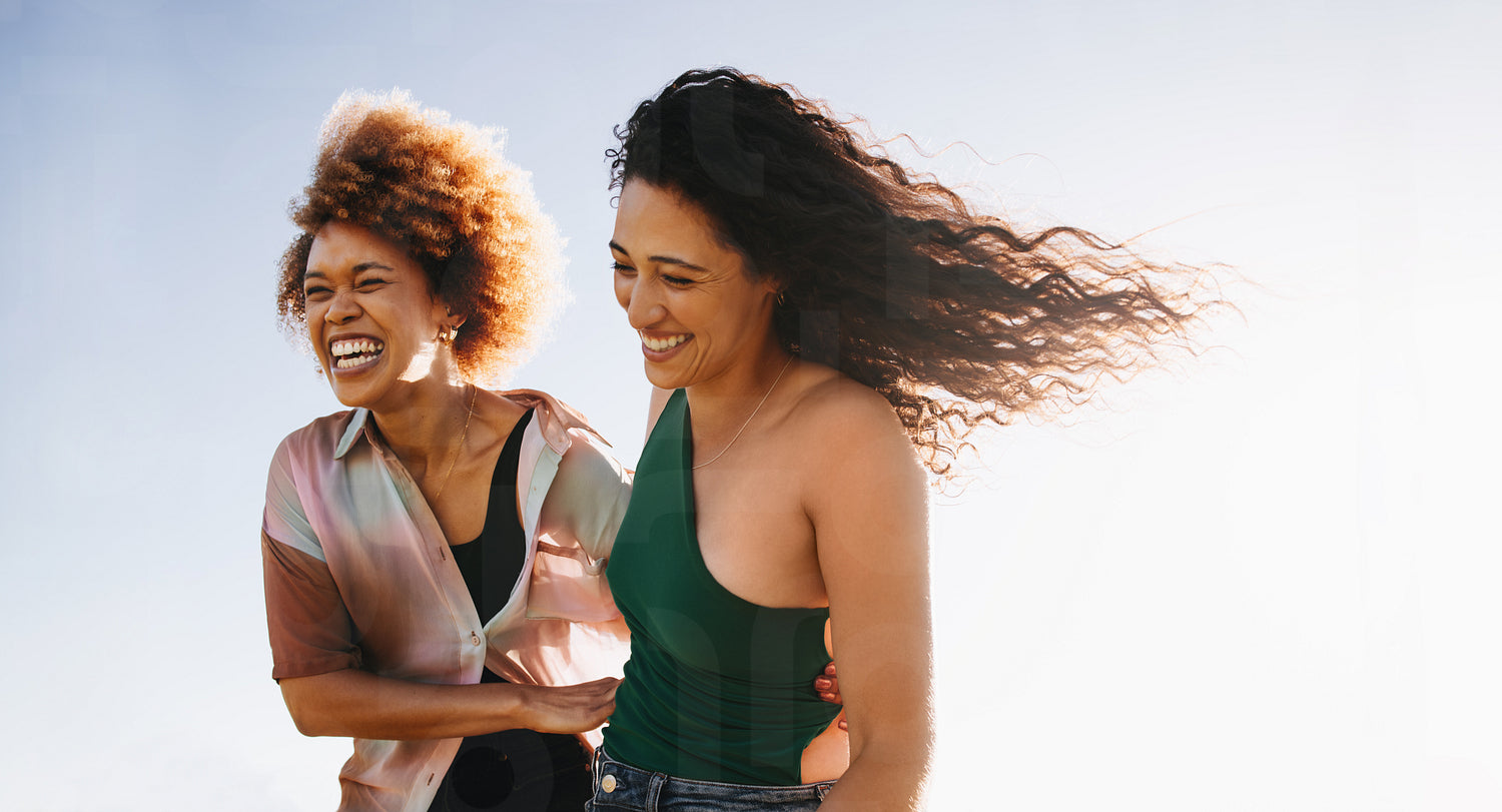 Two girlfriends enjoying fun moments outdoors during a college break. Laughter and friendship captured on a bright, sunny day.