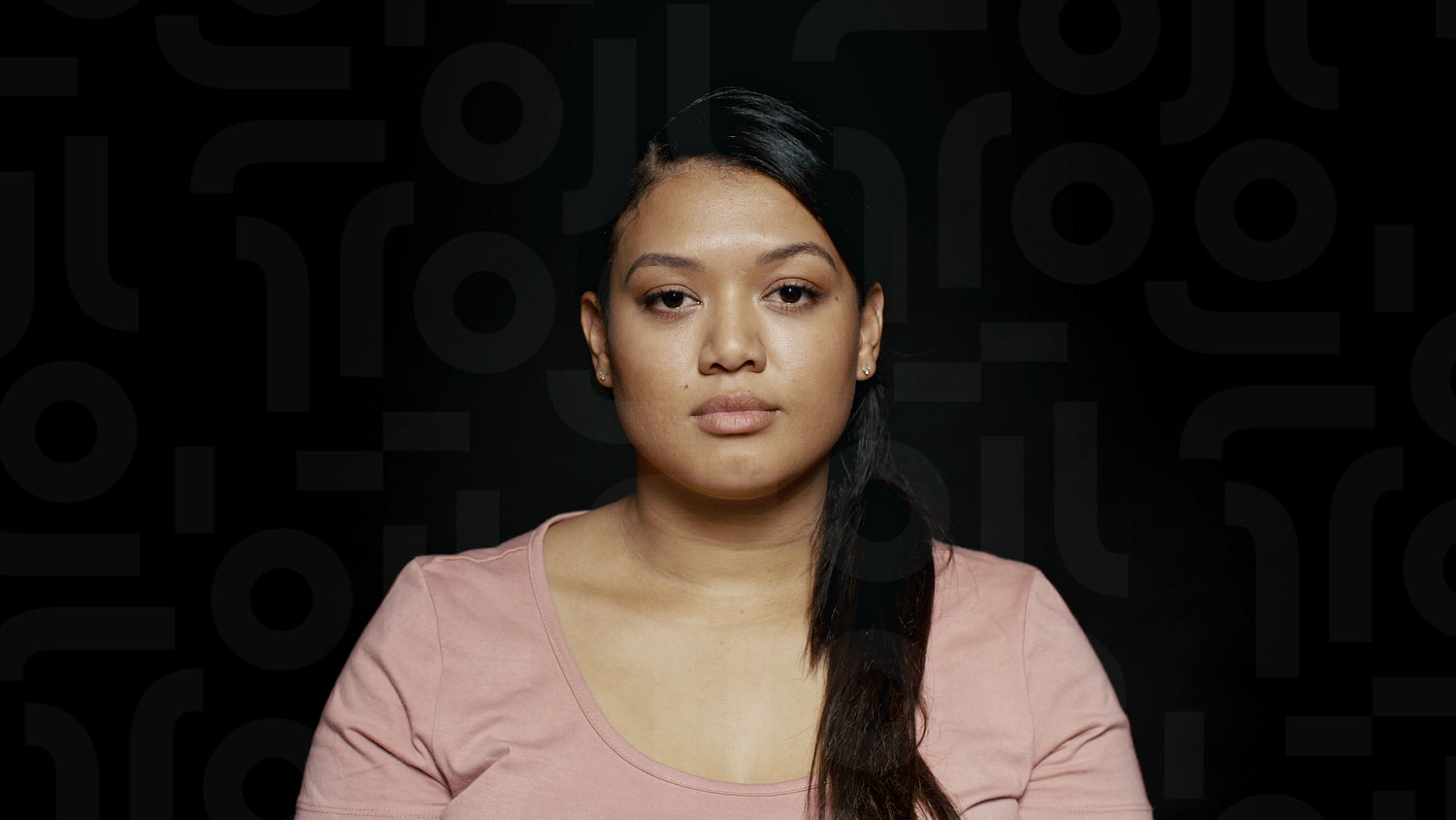 Close up of a happy young woman in tshirt on black background. Woman looking at camera and smiling.