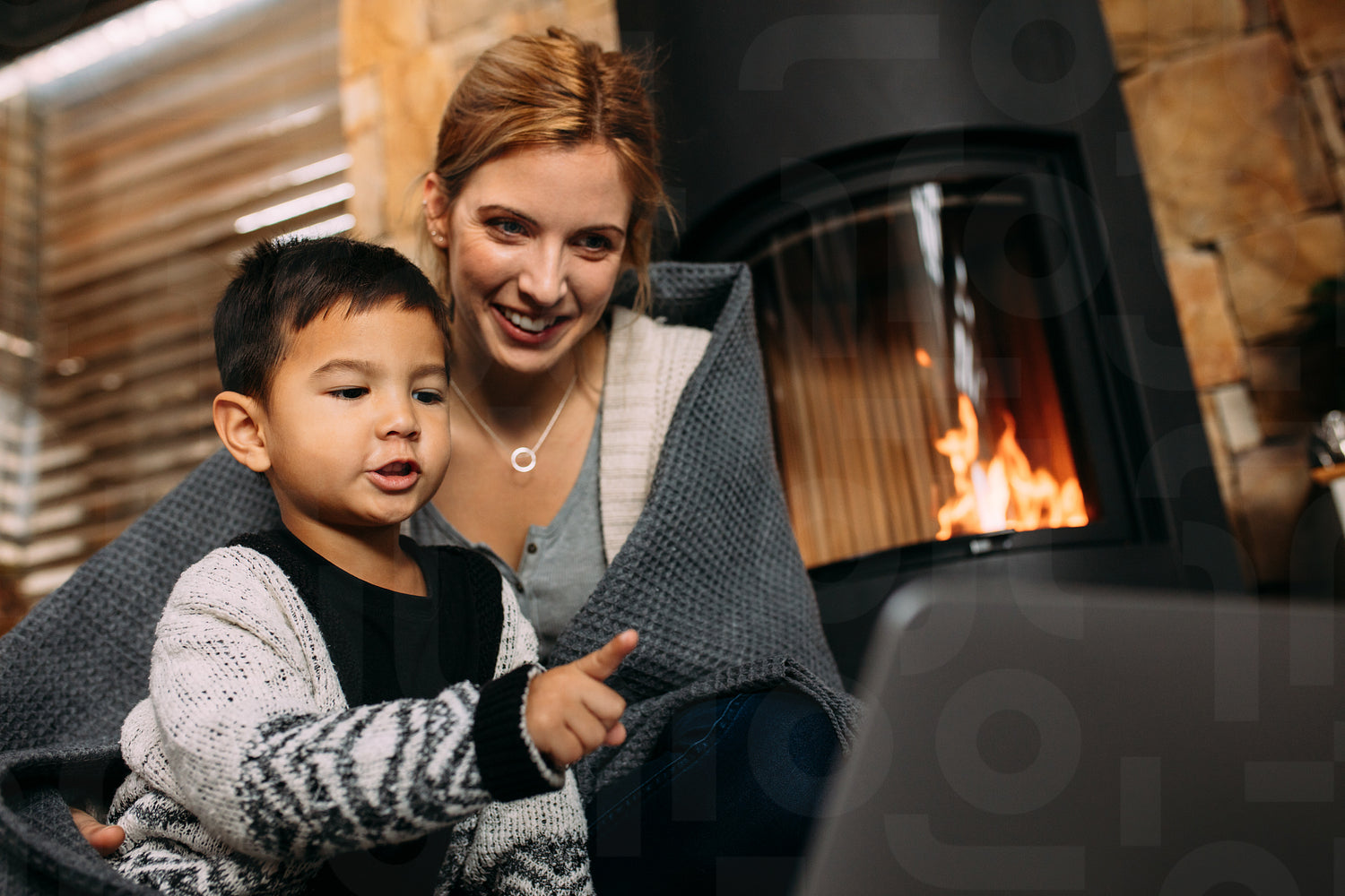 Little boy pointing at laptop while sitting with mother near fireplace at home. Mother and son looking at something interesting on laptop computer in living room.