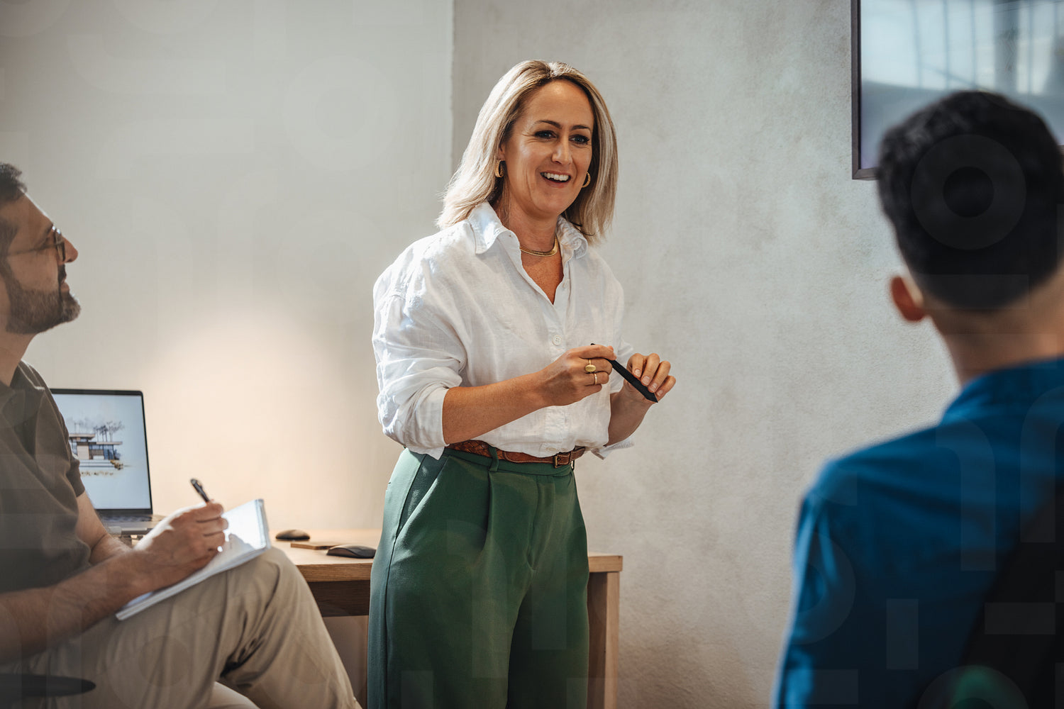 A professional architect, a middle-aged woman, leads a discussion with team members in an office environment, fostering engagement, teamwork and innovative brainstorming.