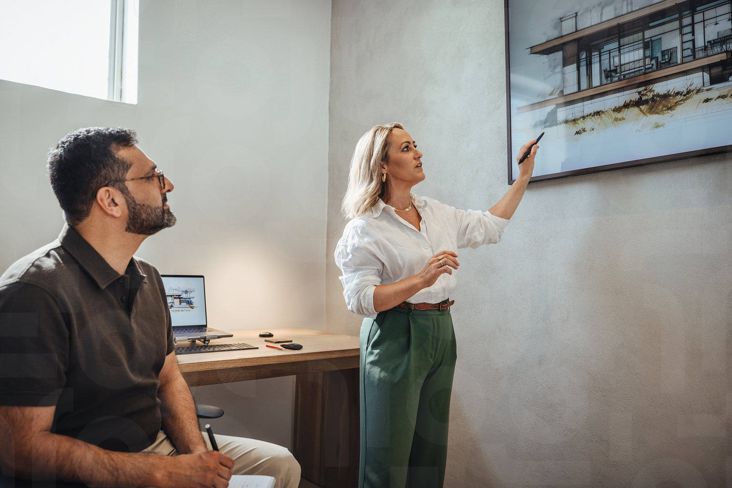 Young woman presenting architectural designs to middle-aged man in modern office setting