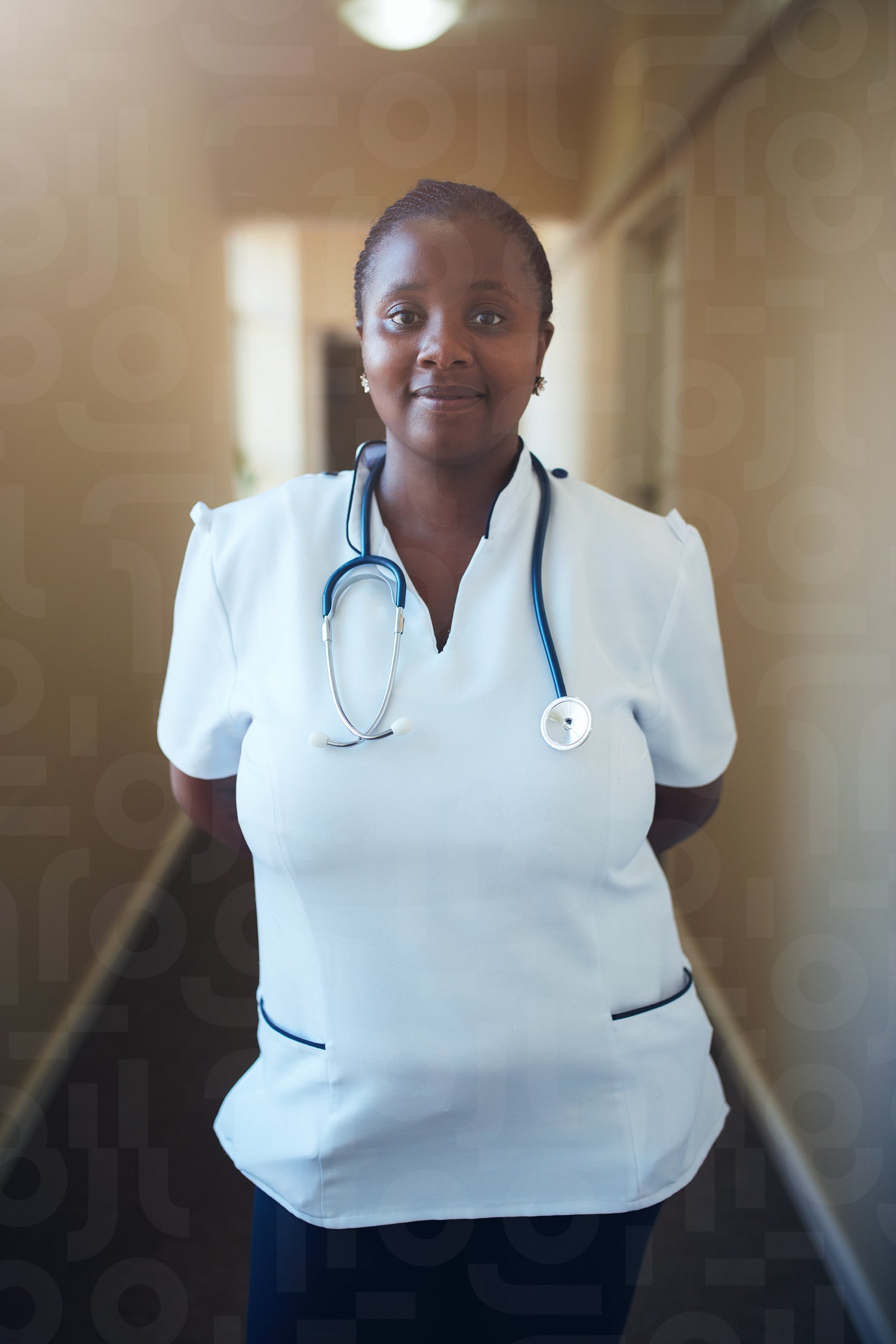 Portrait of happy african female nurse standing in hallway. Positive and caring female doctor with stethoscope.