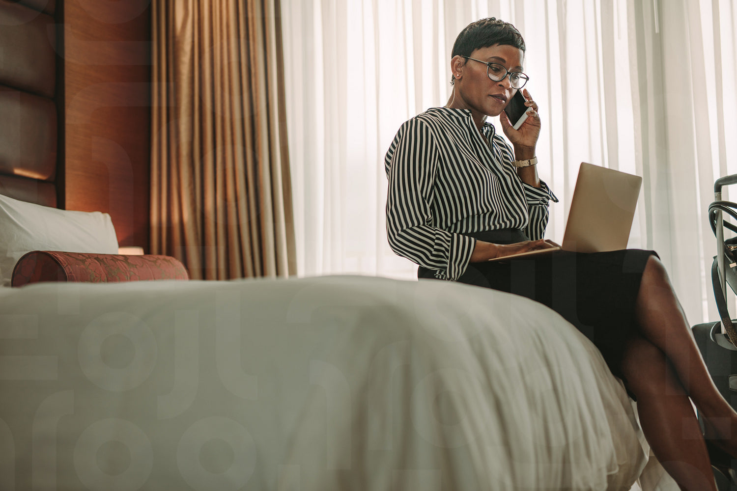 African businesswoman on tour working with laptop computer and mobile phone in hotel room. Female CEO on working from hotel room.