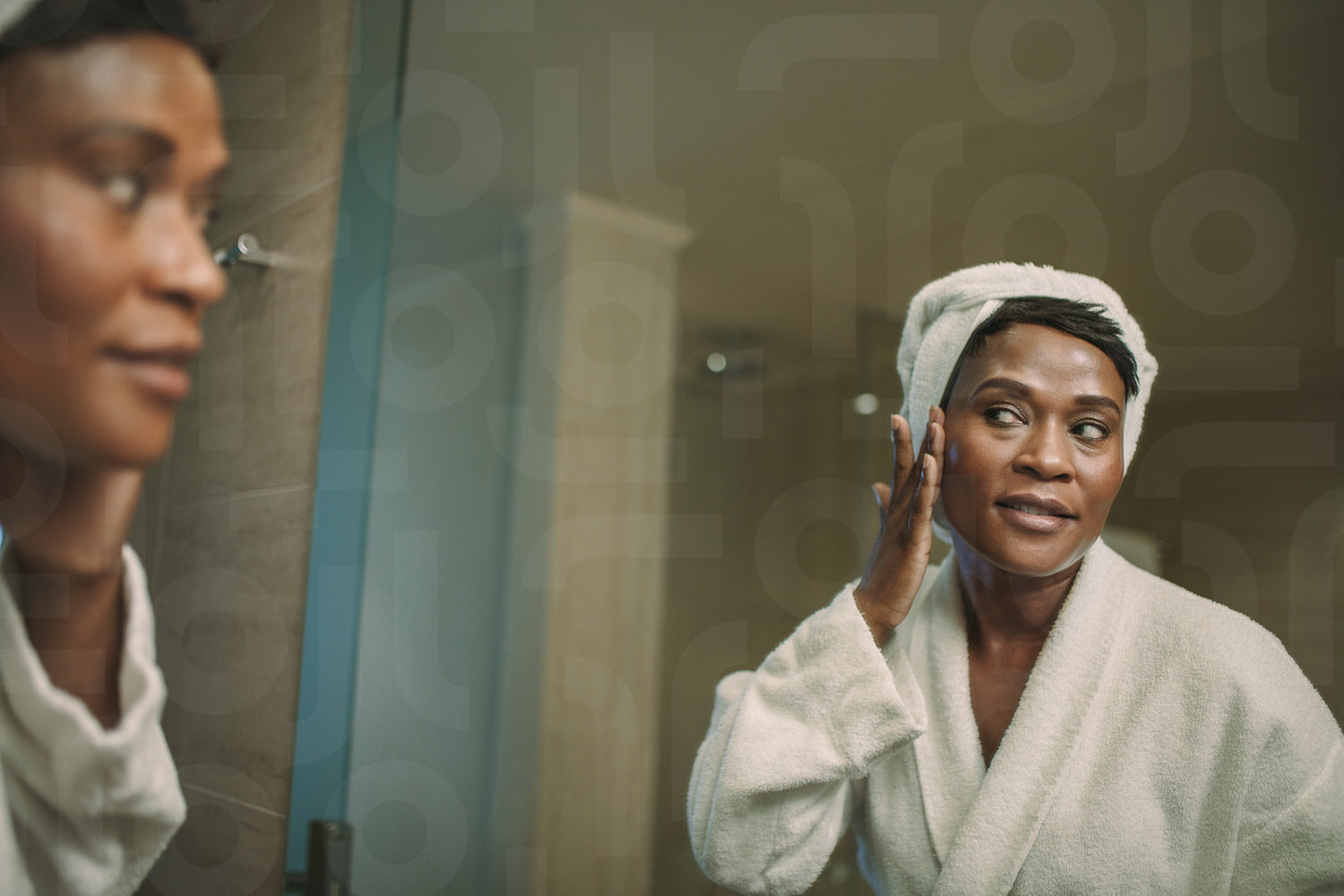 Reflection of mature african woman in bathroom mirror applying cosmetic cream on her face. Mature female in bathrobe putting on cream on her face skin.